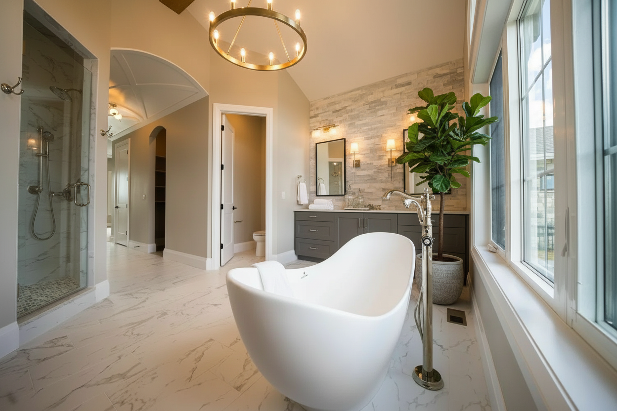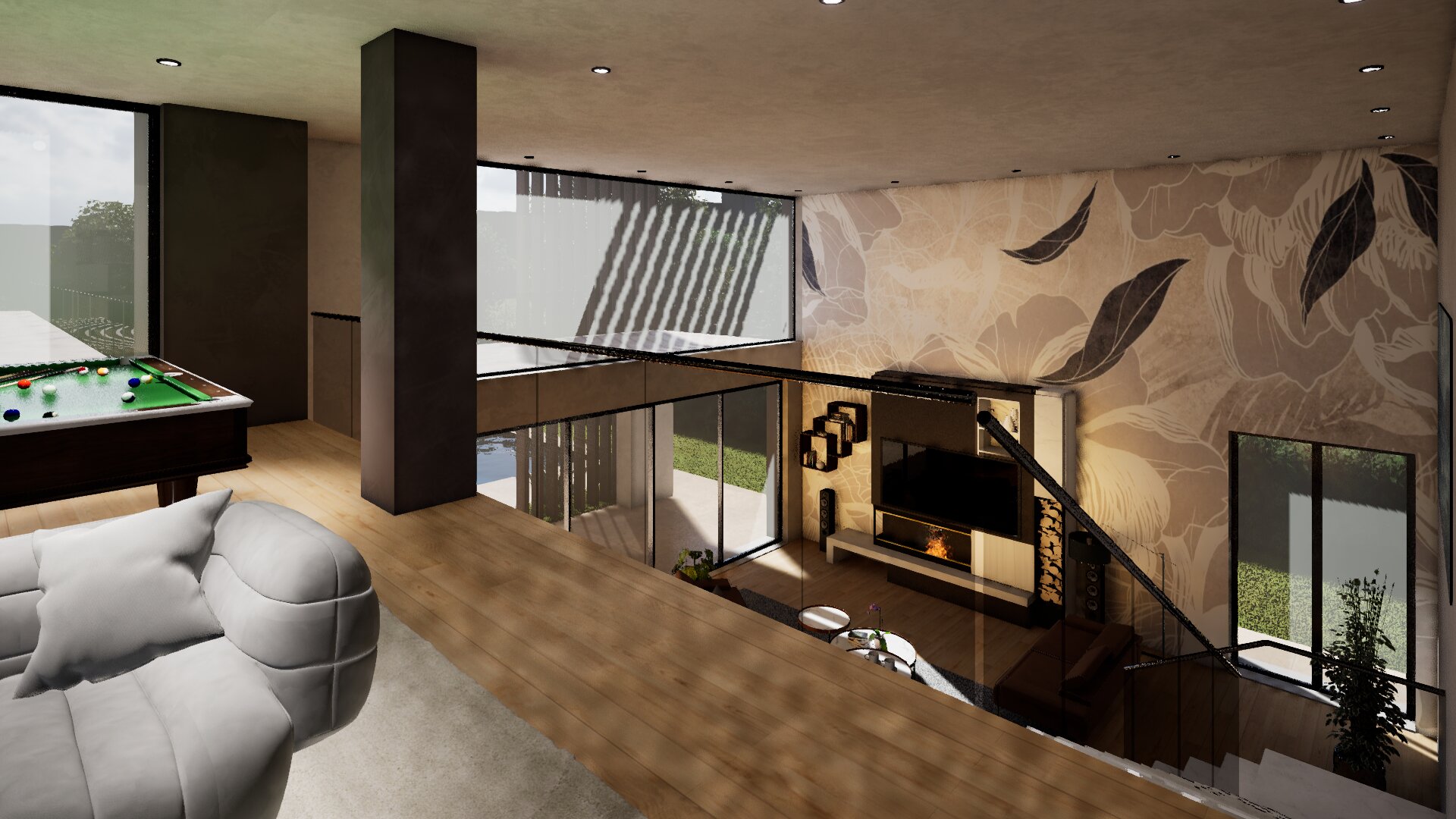 render a modern living room with a sleek atmosphere the walls are a light gray creating a calm background feature large windows with a view of lush green trees allowing natural light to flood in include a dark polished wooden bar with stylish black and white bar stools place a plush gray sofa on a cozy cream colored rug add a contemporary billiard table with a vibrant green surface and dark wooden edges the floor is warm light wood enhancing the inviting atmosphere decorate the walls with geometric abstract art framed in gold maintain a soft ambient lighting for a sophisticated look
