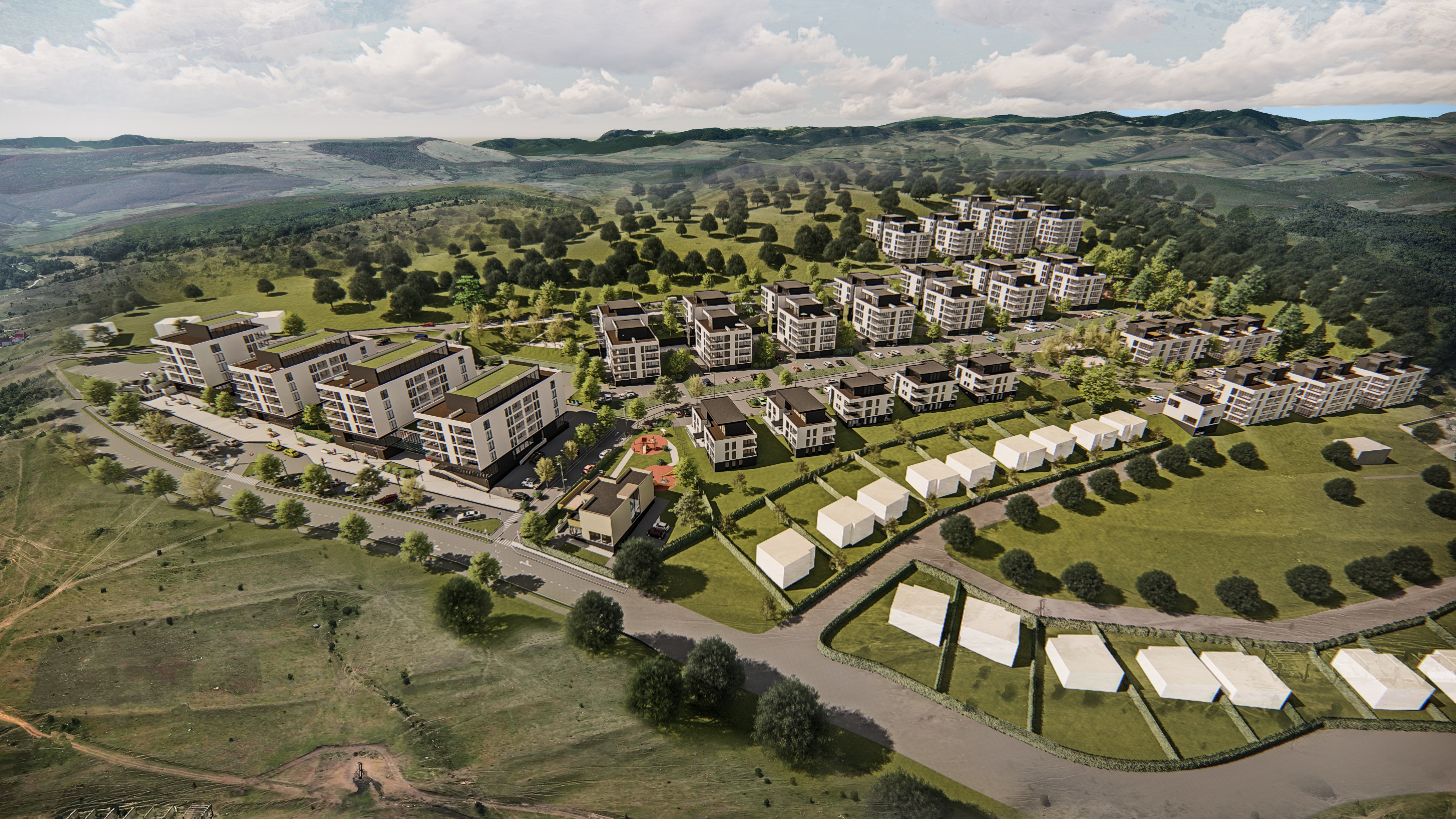 important preserve the existing geometry and the existing context exactly as provided do not modify alter reinterpret add remove scale or reshape any geometry do not change the site surroundings street layout neighboring buildings vegetation or context elements do not modify geometry scale proportions buildings road layout sidewalks or surrounding context in any way do not change text photorealistic architectural rendering clean and balanced contrast calm cinematic mood style contemporary european residential architecture minimalist premium understated include people subtle motion blur for realism keep the green roof