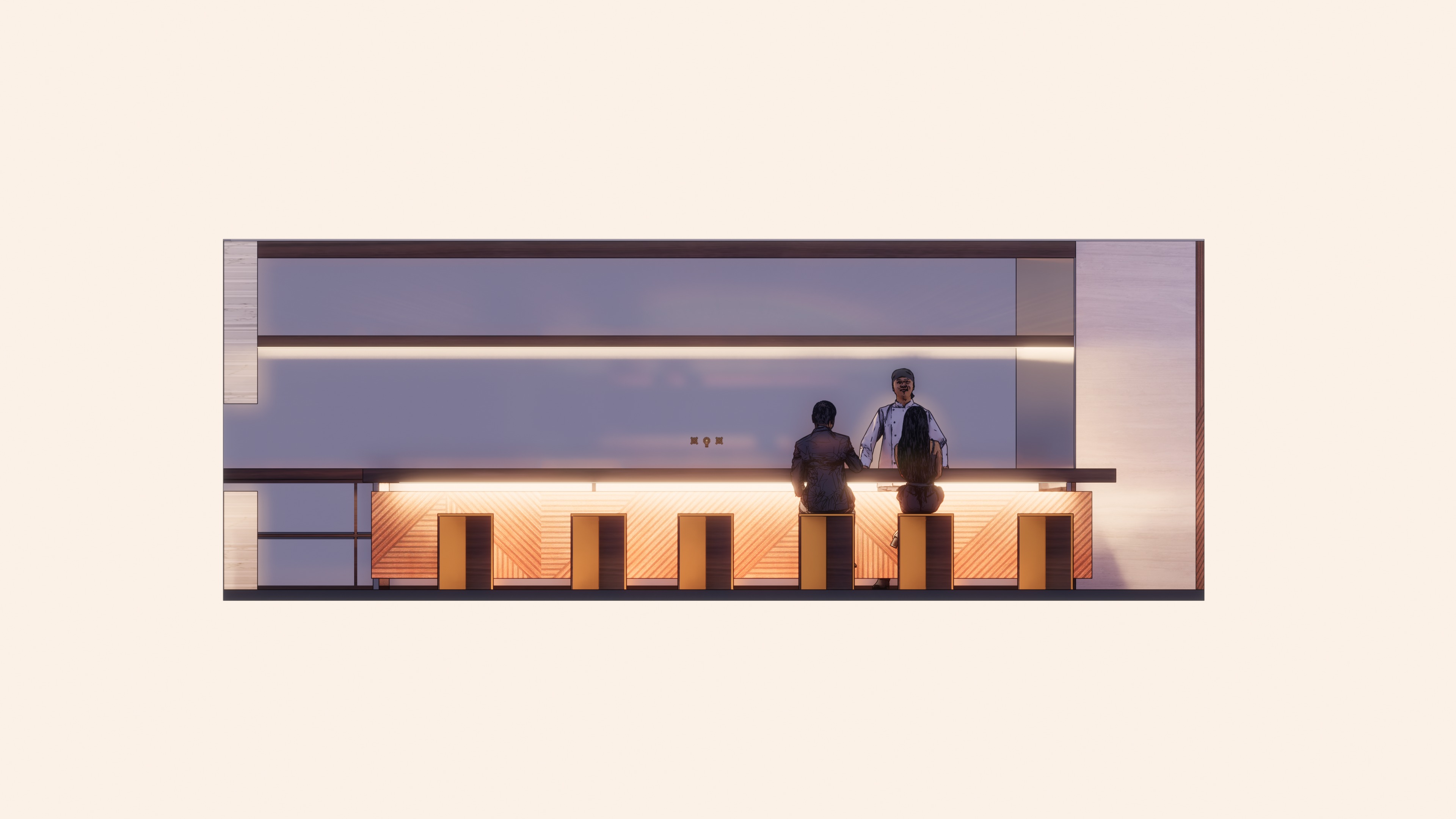 please keep elevation the same but make back wall more of a chrome also make the barstools chrome but keep the same shape that they are right now make the lighting moodier i want the light to be a little bit dimmer under the bar and can you add a few sake bottles to the back shelf add a few sake cups onto counter