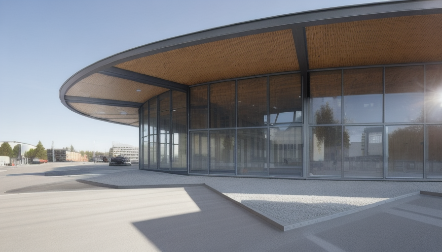 modern exterior shot modern bus station steel construction wooden roof accents horizontale massivholzdecke glas facade sliding doors concrete floor located in the city shadow cast by sun city buildigns in the background street architecture