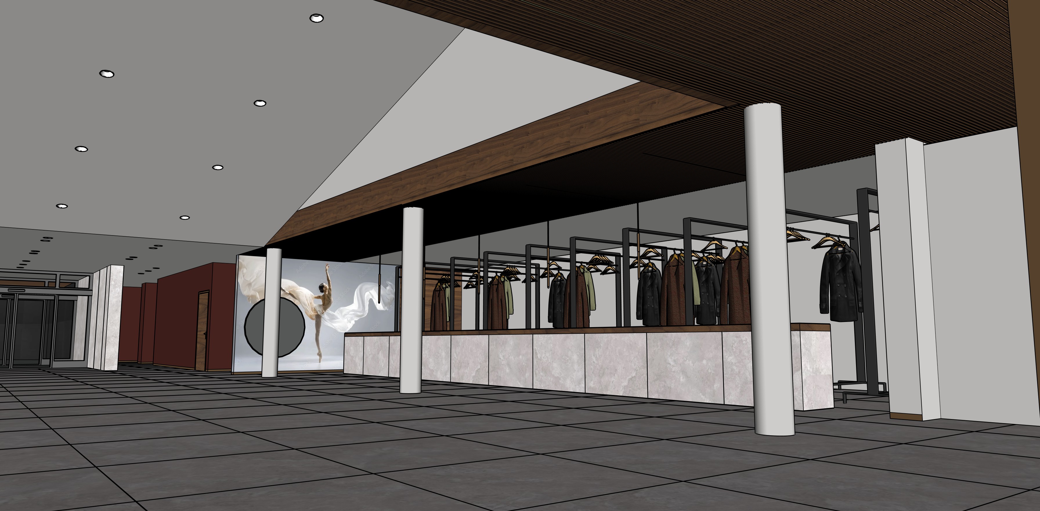 modern cultural building foyer interior warm light elegant people people also in front of picture light interior matte floor led between ceiling slats spotlights on a sloping ceiling circular mirror with backlight photo wallpaper
