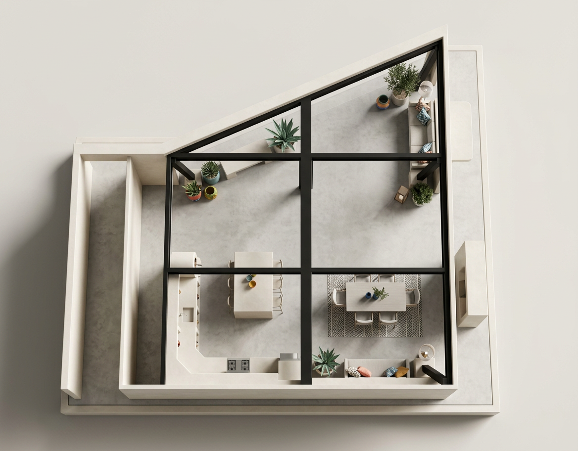 convert this floor plan into a realistic isometric 3d view of a full house show the space from an elevated angle with furniture walls and details visible isometric top down view of a modern outdoor pergola kitchen with accurate proportions and no enclosed walls the pergola has a matte black frame with visible posts and beams defining a clear structural grid inside the pergola create one dominant l shaped outdoor kitchen island the main horizontal run is long and spans most of the width between posts approximately 12 14 feet the vertical leg extends downward approximately 10 12 feet the island has consistent depth and clean 90 degree geometry the island is made of smooth coastal microcement in a warm white tone with built in open shelving niches appliances a 5 ft grill centered on the main horizontal run a pizza oven on the left end of the main run a sink integrated along the vertical leg important do not add any kitchen along the back wall do not create additional kitchen zones only one l shaped kitchen add a secondary element a long narrow rectangular prep and seating surface placed parallel to the main run minimal thickness clean slab form used for both prep and seating approximately 8 10 feet long floor existing poured concrete slab soft gray tone slightly imperfect texture no tile pattern environment open air structure no walls no rooms maintain clear walkways around the island style minimal mediterranean coastal architectural clean monolithic forms no bulky cabinetry use the same furniture as shows on the plan do not change the orientation of the floorplan