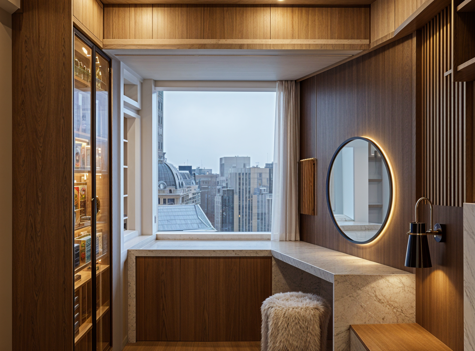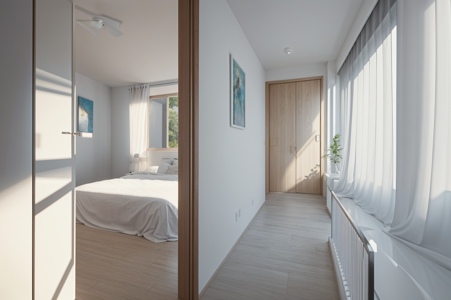 render this screenshot as if it were an ultra realistic photograph stay true to the original image in terms of structures geometry and materials please turn on the wall mount light the flooring will be in light wooden oak doff flooring white doff finish door and brightened the room and make it white