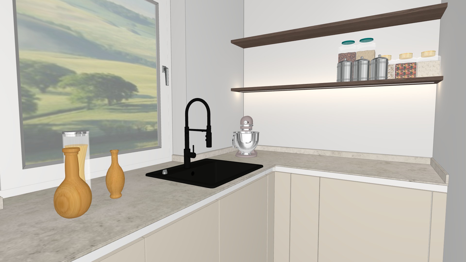 the worktop is made of taj mahal the wood is dark grey smooth kitchen frames