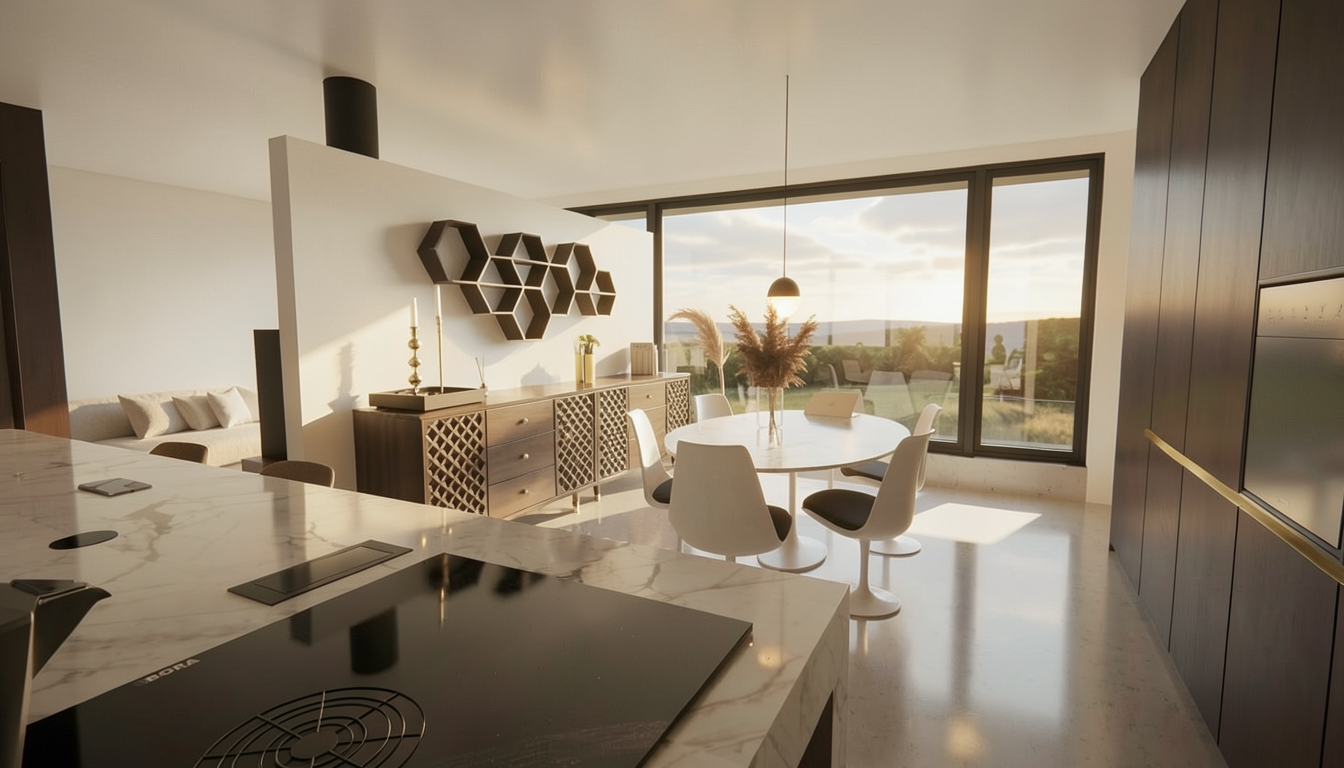 preserve exactly the existing architecture layout proportions materials furniture and design identity do not change walls openings cabinetry or furniture placement introduce natural daylight coming from the existing window openings as on a bright clear greek day the light should feel mediterranean warm soft and directional with gentle sun diffusion and realistic shadow fall enhance realism through subtle details accurate light bounce soft highlights on materials realistic textures and true to life reflections no design enhancements maintain a calm architectural atmosphere with a clean editorial look similar to a professional interior photography shoot camera feel eye level realistic lens natural depth of field no distortion overall result a real life photograph look timeless elegant and believable as if shot by a professional interior photographer in greece