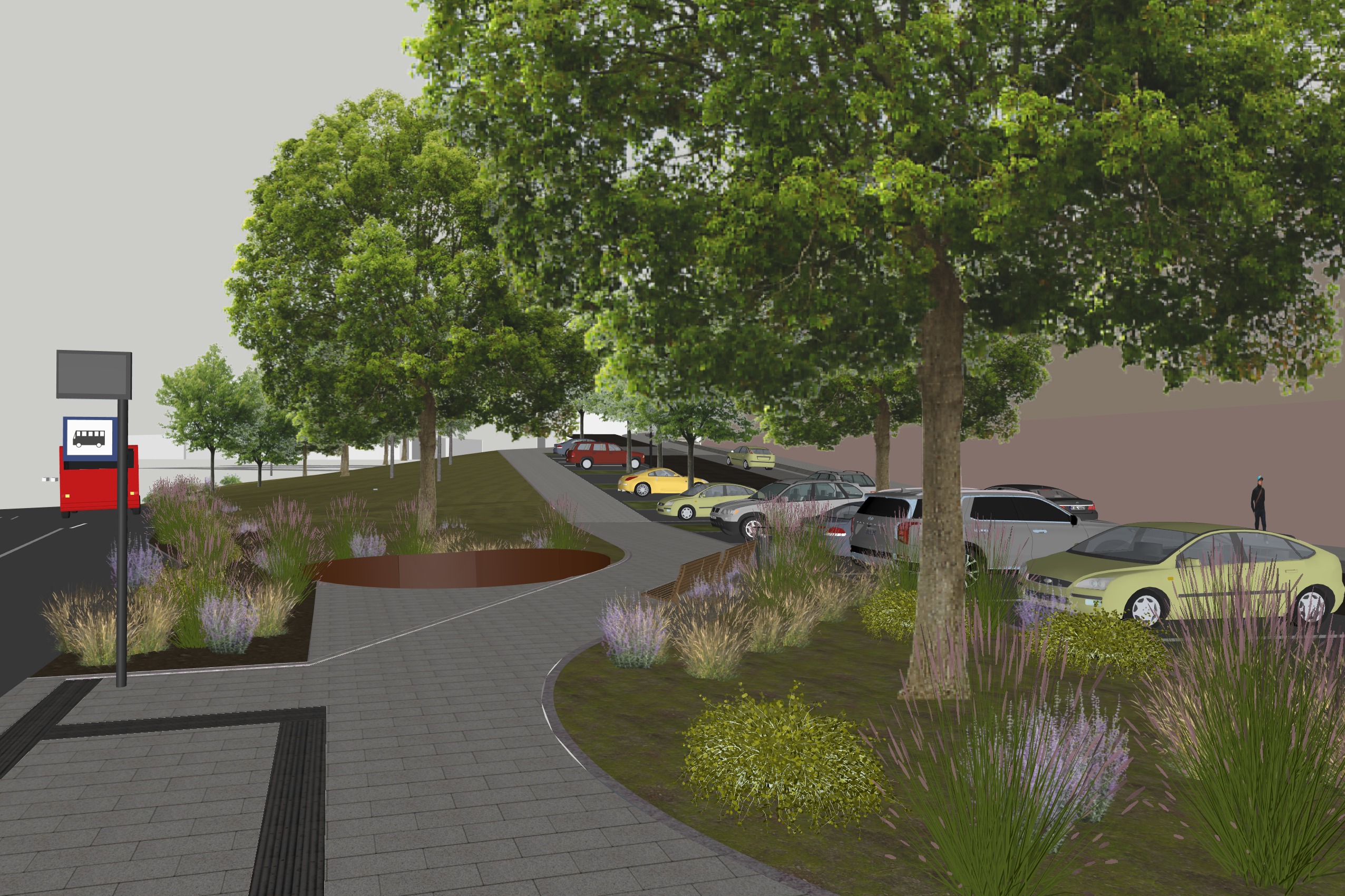 ultra realistic architectural visualization based strictly on the provided raw sketchup view preserve exact geometry proportions camera angle composition and architectural details do not redesign or alter the building enhance only with realism add realistic materials with physically accurate textures natural wood grain brushed concrete glass reflections subtle imperfections micro surface details use high dynamic range lighting with soft global illumination and realistic shadows create a lively atmosphere add a few naturally positioned people interacting casually walking talking using phones subtle motion blur on some figures for realism include small groups rather than posed characters add a few animals appropriate to the setting e g birds in the sky avoid people and dogs in the middle of the road enhance environment with greenery slight wind in trees varied vegetation tones small urban details parked cars benches subtle signage add depth with atmospheric perspective and realistic sky conditions golden hour soft overcast choose whichever enhances the mood cinematic composition photorealistic rendering 8k detail realistic depth of field natural color grading slightly warm tones architectural photography style shot on full frame camera 35mm lens maintain realism over stylization avoid cartoonish or ai looking artifacts the reound bown texture under the tree is smooth corten