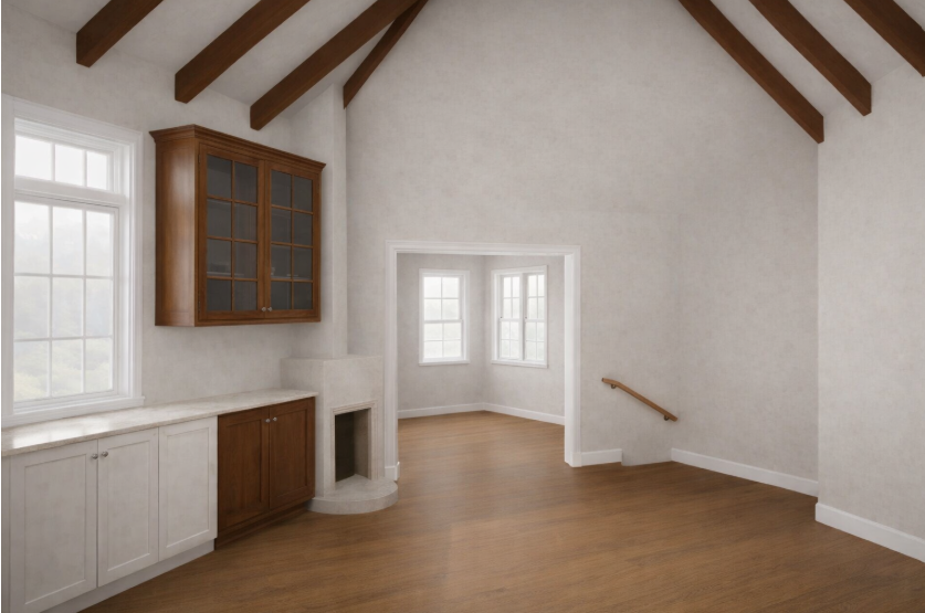 extend the hutch all the way down to the countertop and remove one of the cabinets closest to the fireplace so that there is a gap between the fireplace and cabinets