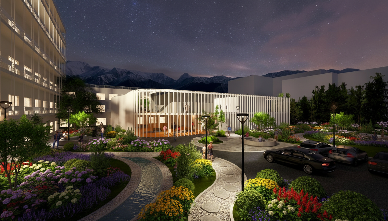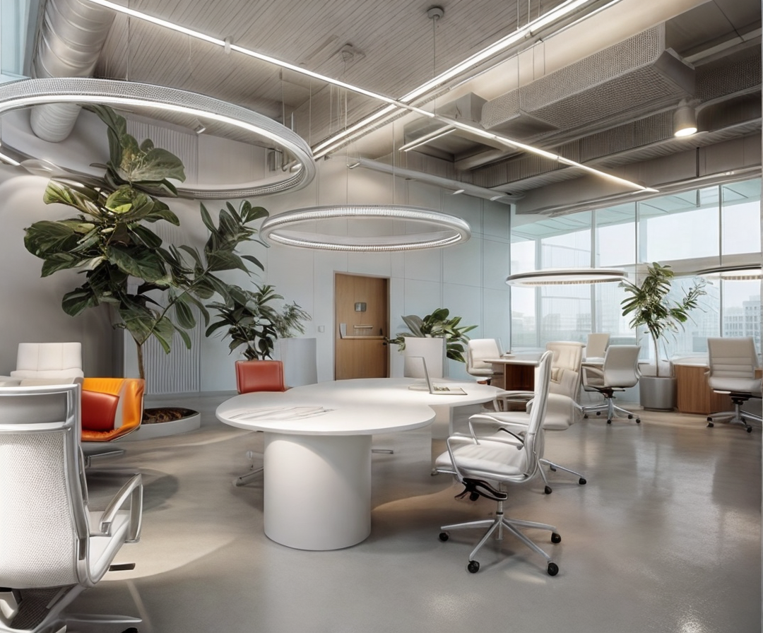 interior shot generate a industrial bauhaus office interior with black chairs white tabletops lush greenery exposed concrete ceiling with visible hvac system painted white