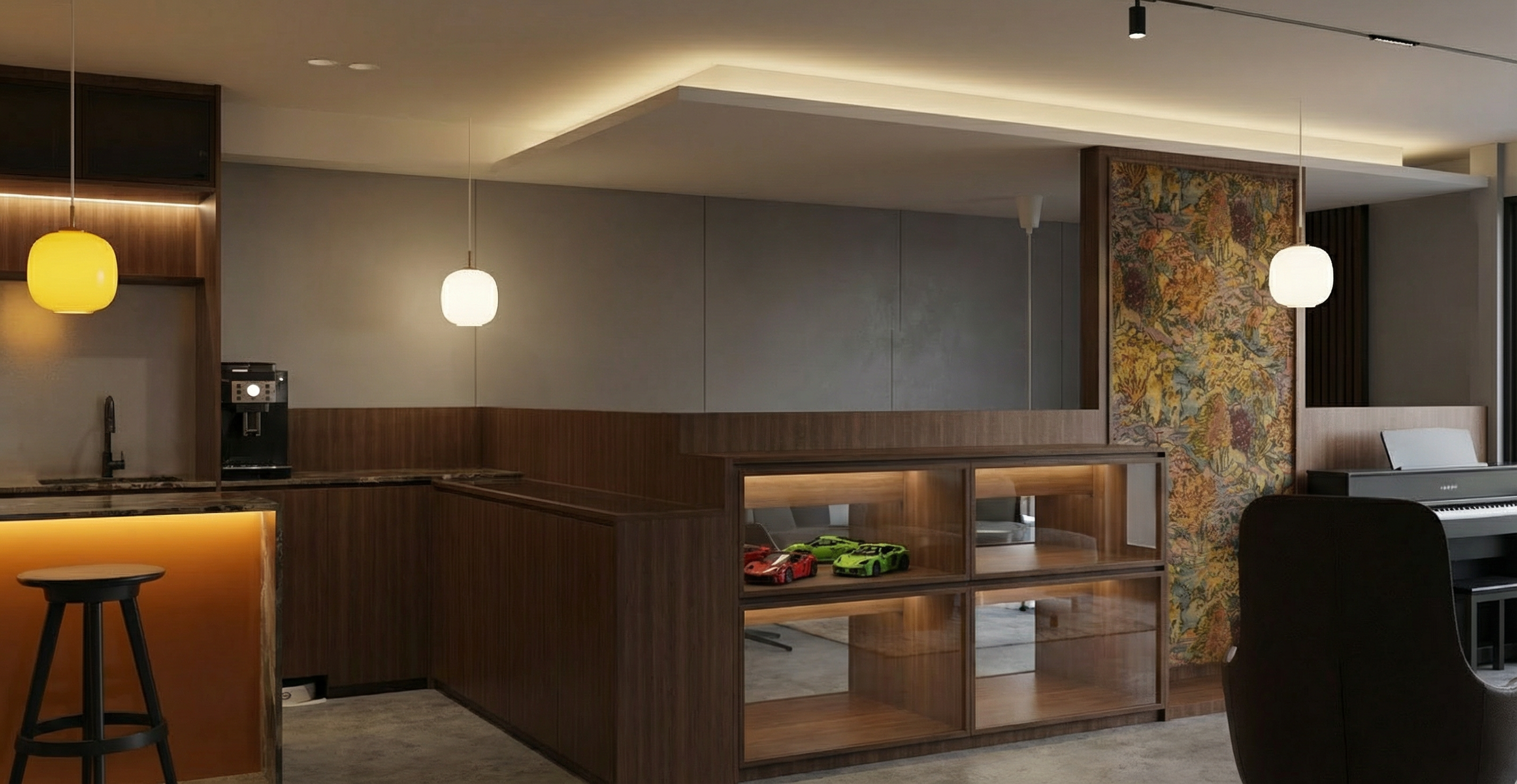 make the wood colours and texture less grains accurate the backsplash is backlit white and the island is backlit orange