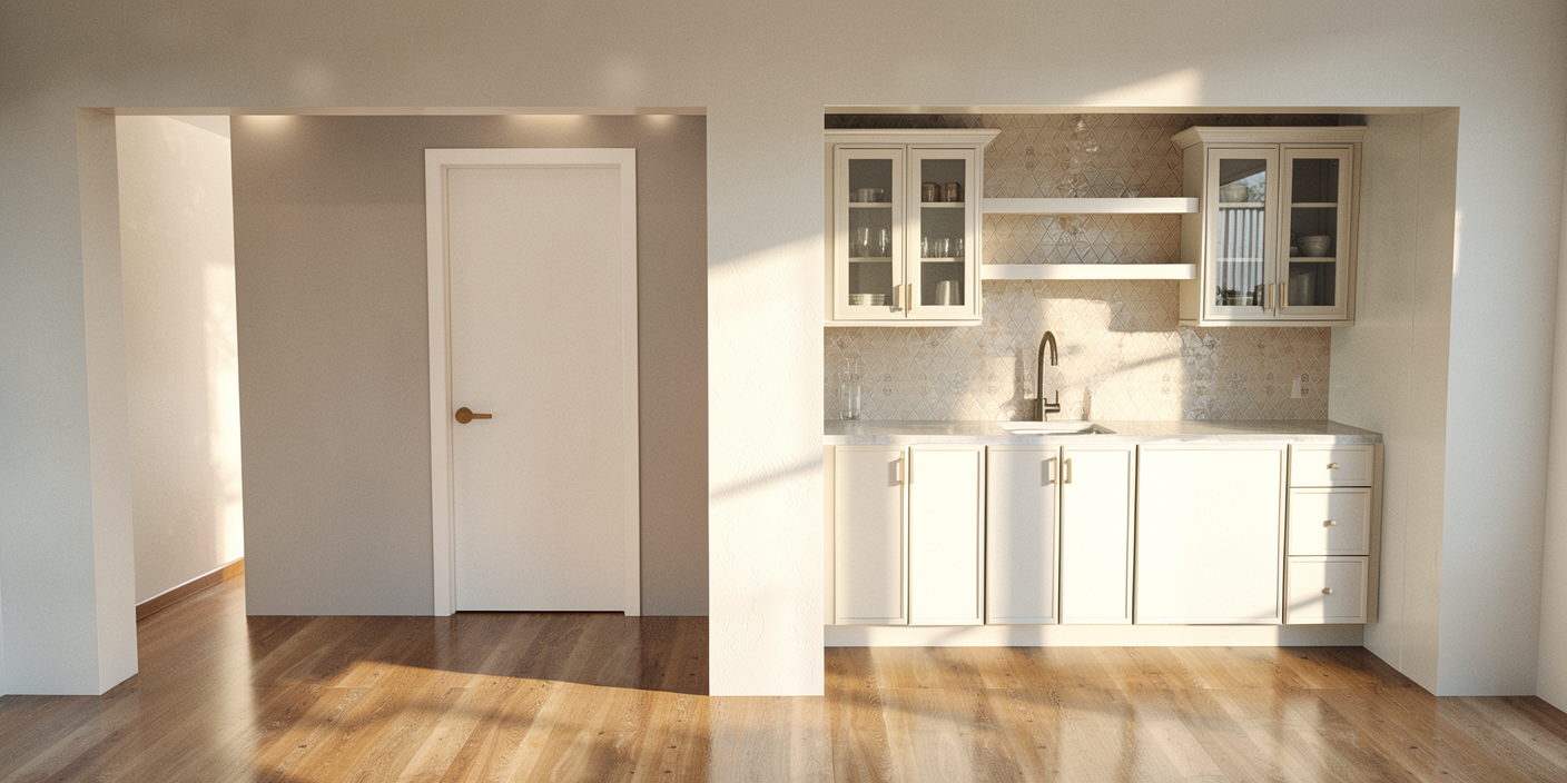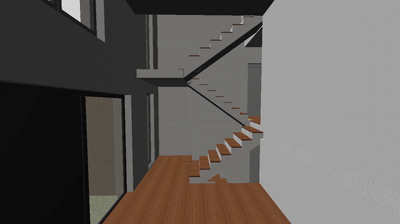 create a photorealistic 3d visualization of the uploaded staircase include a 1m glass railing on the stairs