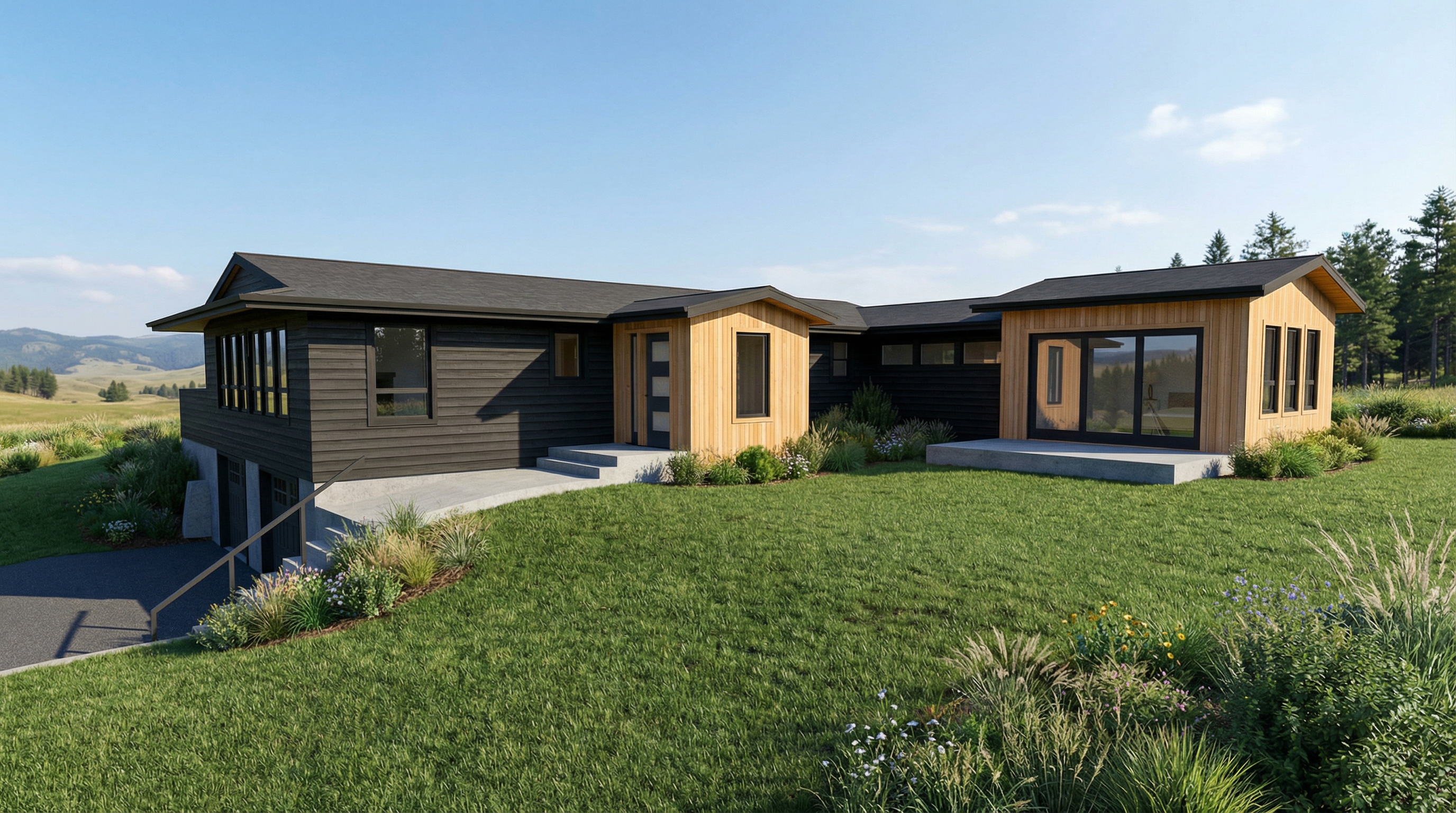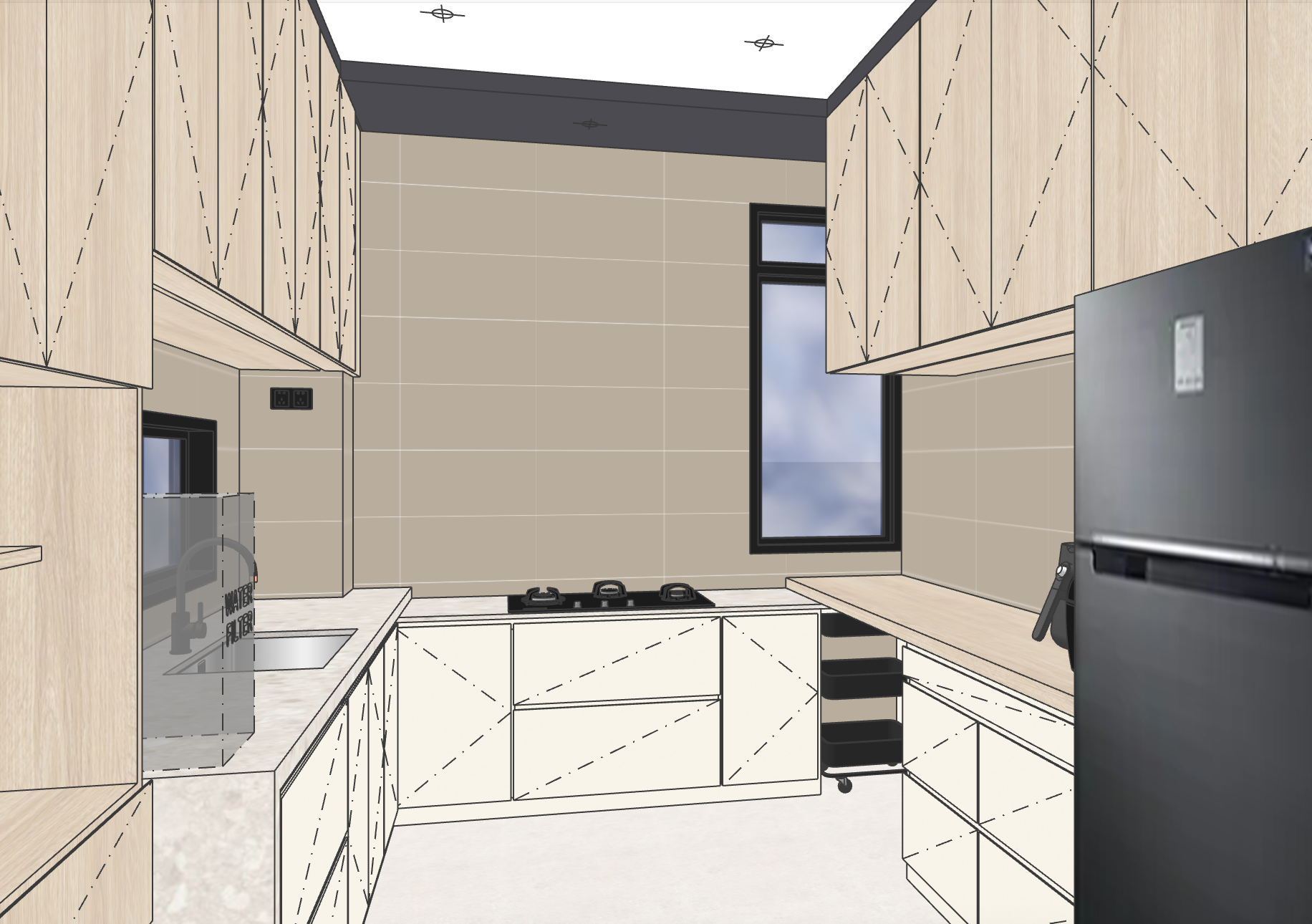 light timber finish full height cabinet and top hung cabinet warm beige bottom cabinet with soft grey marble top with contrasting charcoal top frame and matt black fridge on the right window viewing out to simple backyard garden