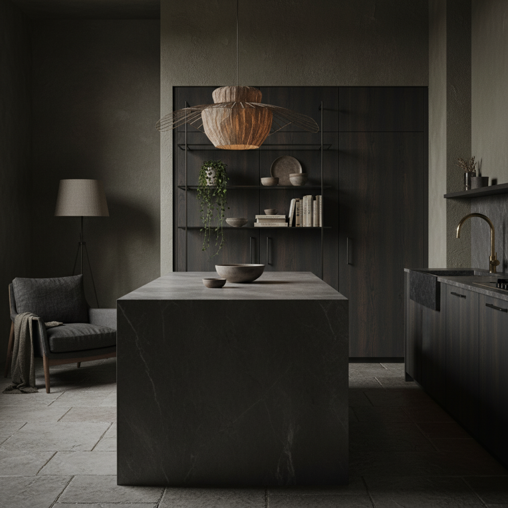 do not change anything on the shelving unit put it in a moody organic modern home office resting the bottom legs on a cabinet do not add any lighting under the shelves