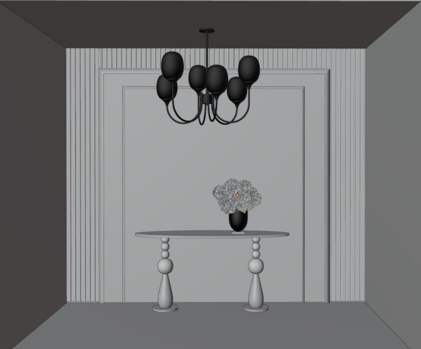 create a hallway entrance as in the photo attached make the console table white make a big mirror on the back wall with panels around it make the floor dark wood make the chandelier clear glass architecture