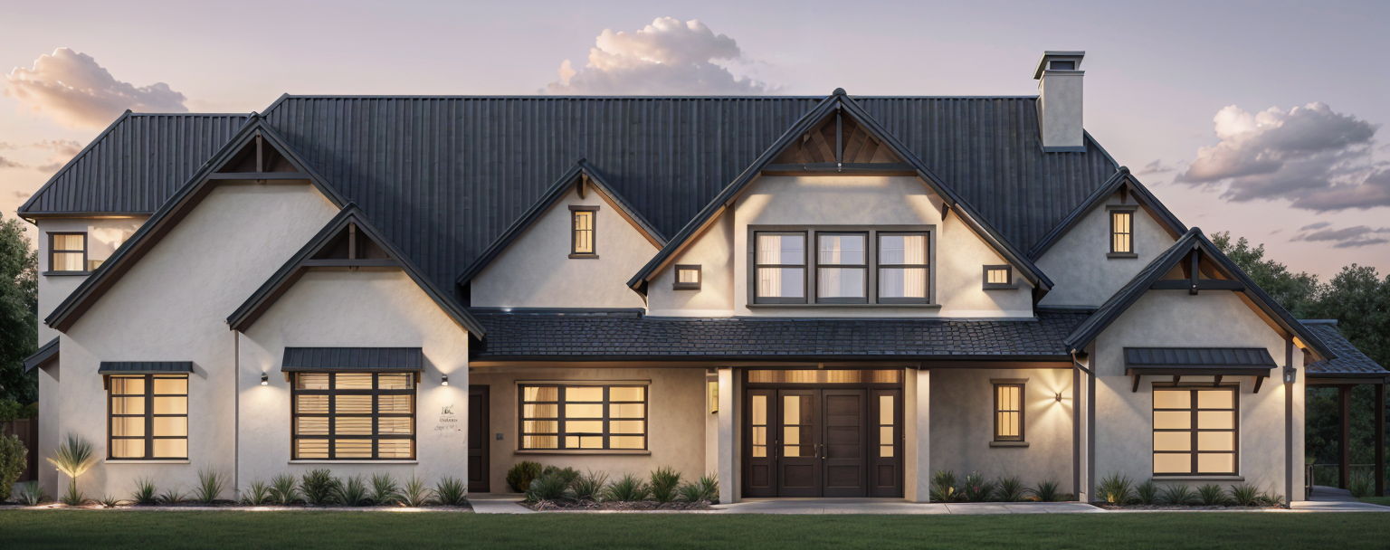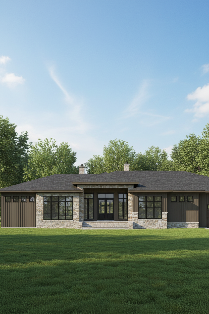 render as a craftsman style with light earth tone stone stone sill dark bronze color vertical nickel gap siding not board and batten black windows and trim dark charcoal asphalt hip style roofing grass in foreground and trees in background show full elevation