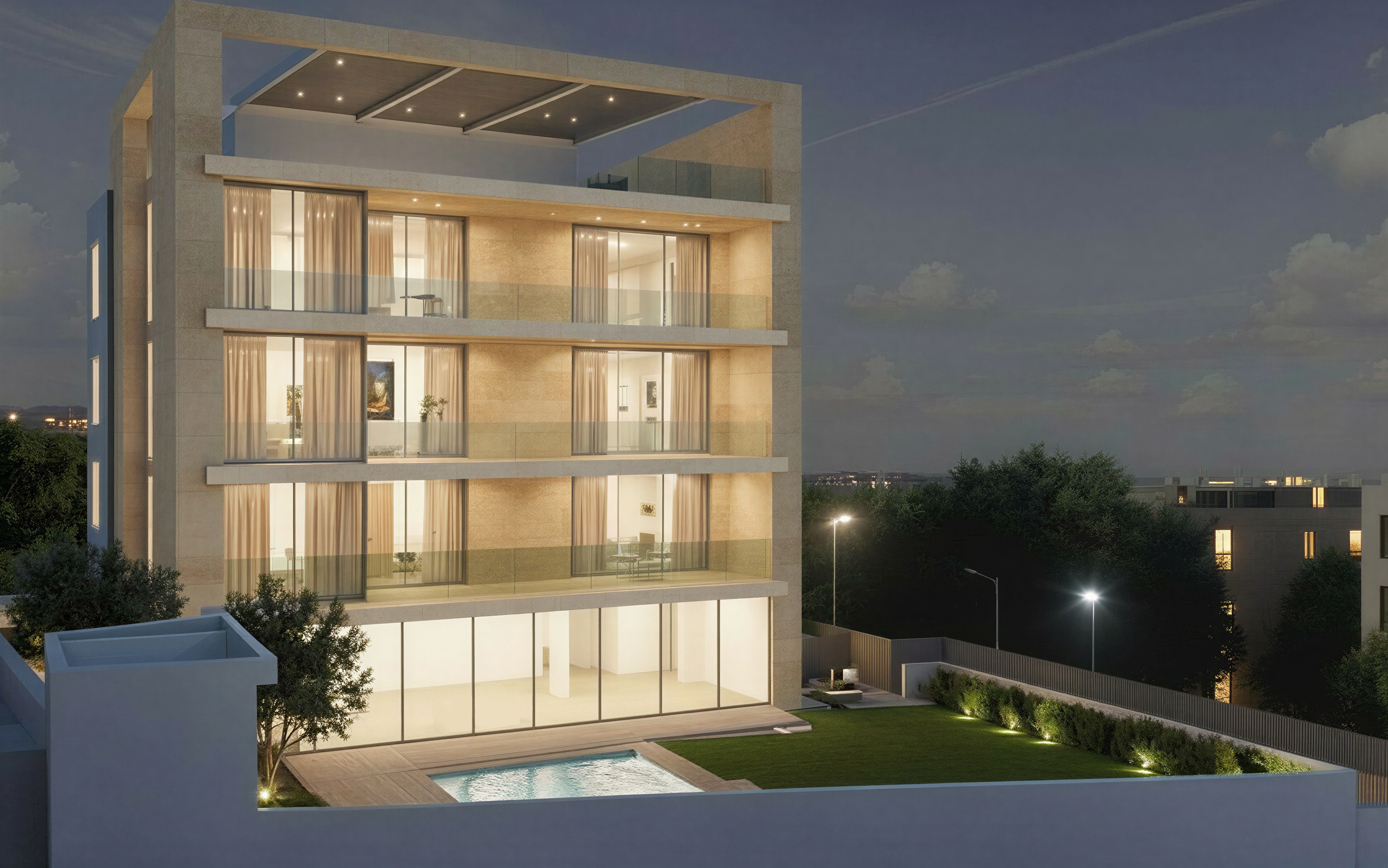 edit only the following and nothing else 1 add a small tree add one small tree on the green lawn area near the pool matching the style shape and scale of the existing trees in the image place it naturally in the lawn area add a few neat low shrubs around the tree trunk keep the placement clean and balanced 2 add people add 3 4 subtle delicate people 2 people on the balconies different floors 2 people on the ground level near the pool and garden area they must be soft colored and not dominant correctly scaled relative to the building naturally integrated with night lighting 3 increase realism enhance the entire image to be more photorealistic stronger clarity and sharpness richer night time contrast but not oversaturated colors improve lighting realism glow reflections material depth subtle increase in definition of travertine glass foliage and pool water restrictions do not change building geometry travertine placement or white wall materials balcony glass railings curtain positions except natural light interaction pool shape deck fences trees already present sky camera angle composition no new objects except the added tree shrubs and people make only the changes listed above