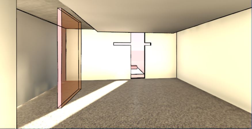 create a realistic image of the exact perspective representing a chapel in a care center for elderly include a mountain vie german alps through the window opening shaped like a cross
