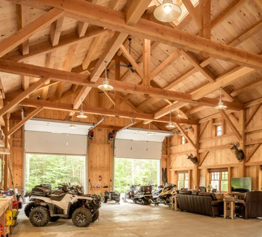 dark timberframe mountains outside wood garage doors