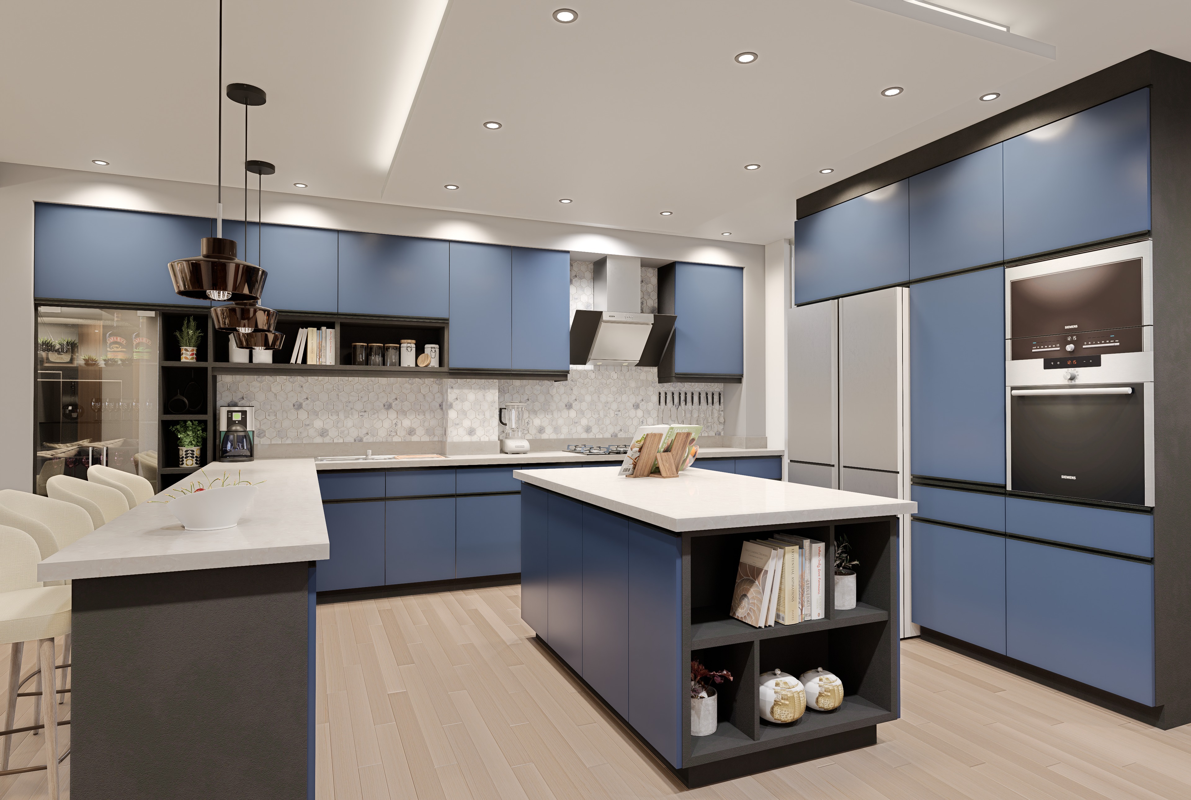 modern minimalist kitchen interior flat panel matte blue cabinetry with black accents white quartz countertops and white hexagonal tile backsplash kitchen island with built in open shelves for books recessed ceiling spotlighting and under cabinet led lights high end integrated stainless steel appliances light oak wood flooring cream upholstered bar stools sharp focus architectural visualization cinematic lighting 8k resolution