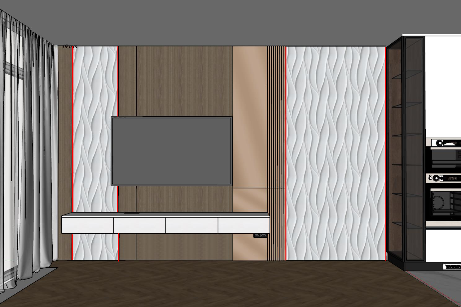 photorealistic enhancement of the provided interior wall design preserve all geometry and panel proportions treat the input image as fixed architectural structure two layer wall construction only front layer wood panels champagne mdf panel and vertical slats on one flat plane back layer white textured gypsum 3d panels recessed behind use the marked vertical red guide lines as hidden led strip positions these lines indicate recessed lighting joints do not render the red lines in the final image led strips are very narrow and fully hidden inside the front panel joints light must wash backward onto the gypsum textured panels soft warm wash light only no glowing columns no light niches no visible fixtures keep the lighting gap thin and precise show subtle shadow depth between the two panel layers natural daylight from the win