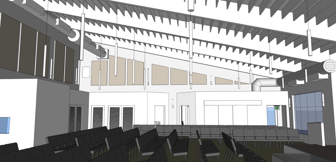 interior of a modern conference hall with high vaulted ceilings featuring exposed beams and ductwork the ceiling should be finished in soft white with light shadows the walls are light beige with large vertical windows that allow natural light to softly illuminate the space the seating consists of sleek dark charcoal gray chairs arranged in rows the floor is covered with a deep olive green carpet that adds warmth modern pendant lights hang from the ceiling glowing with a warm white light in 360 degreee lighting enhancing the welcoming atmosphere the overall ambiance should be bright inviting and professional with a touch of sophistication costal blues and sound panels on upper wall to be mid tones of the same colors