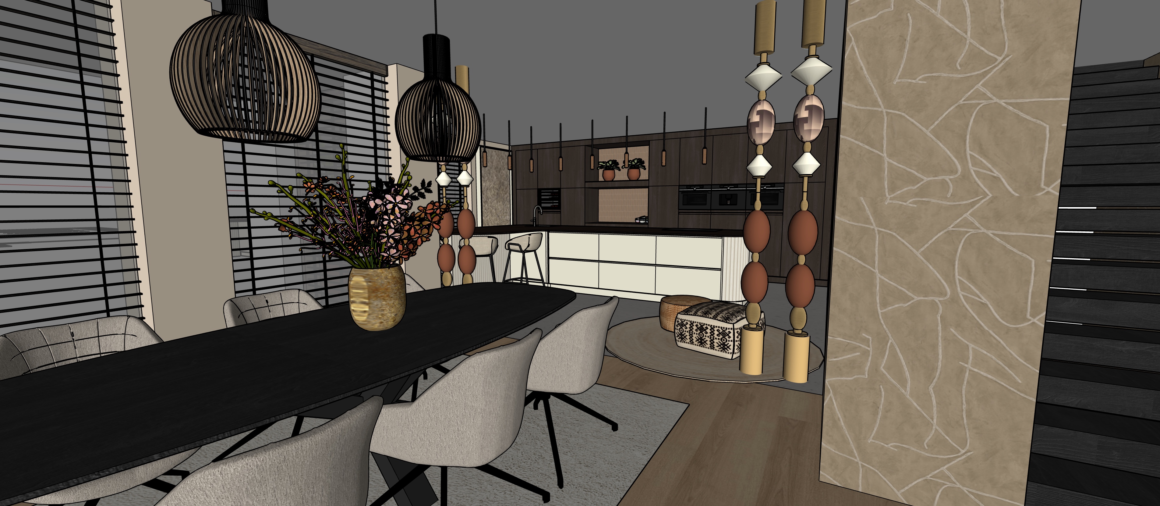 can you make this photorealistic outside it s just light and inside please turn on the lights i d like to keep the materials as shown in the image but i d also like to create some atmosphere with decorations