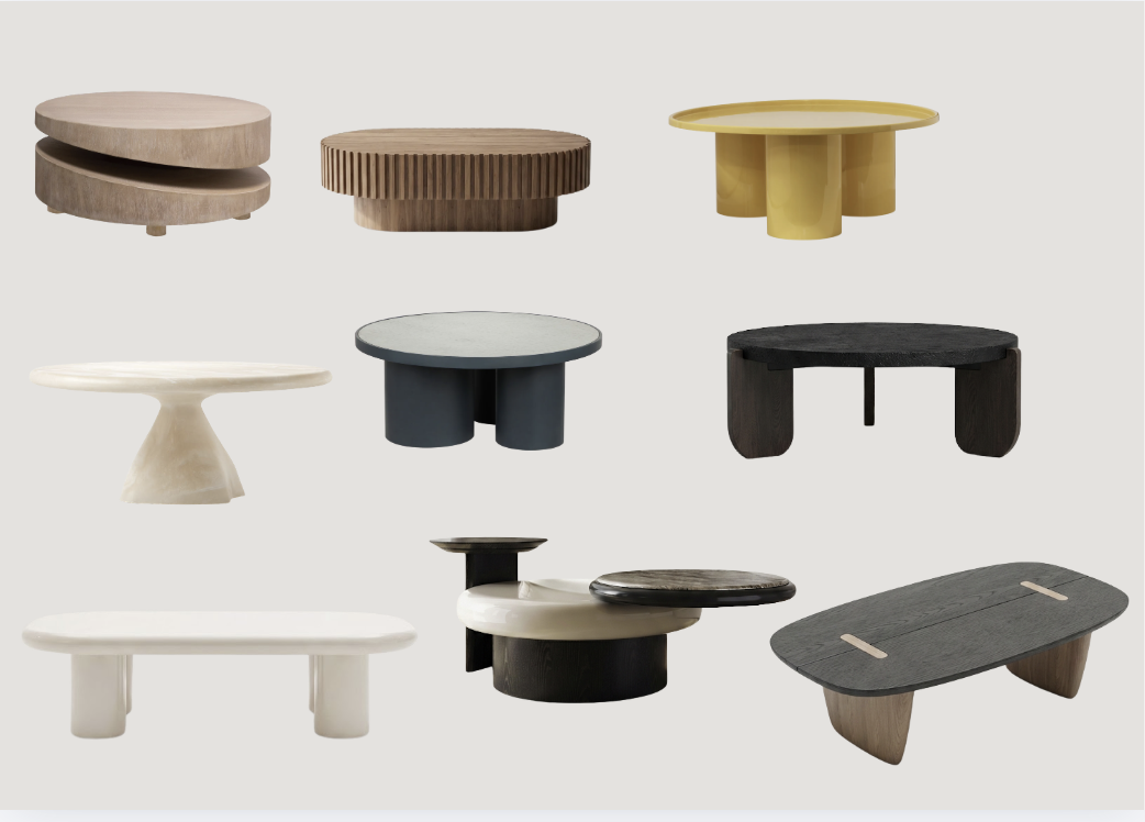 place these coffee tables in a very big room with very high ceilings make the walls a cool white tadelakt and the floor concrete add some light wood elevated surfaces where some of the tables can be shown make these surfaces different elevations some very tall others very short and some medium to give depth to the composition add some grey rugs add natural light to the scene do not modify absolutely anything about the tables and do not repeat them do not add any new tables add an interesting angle to the scene make sure the composition takes up almost the whole page do not mess with the tables sizes