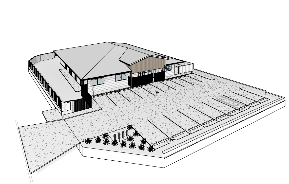 add a bitumen finish to the parking with two cars add childcare shade sails to the left this is the playscape area surrounding the building will be roads with cars