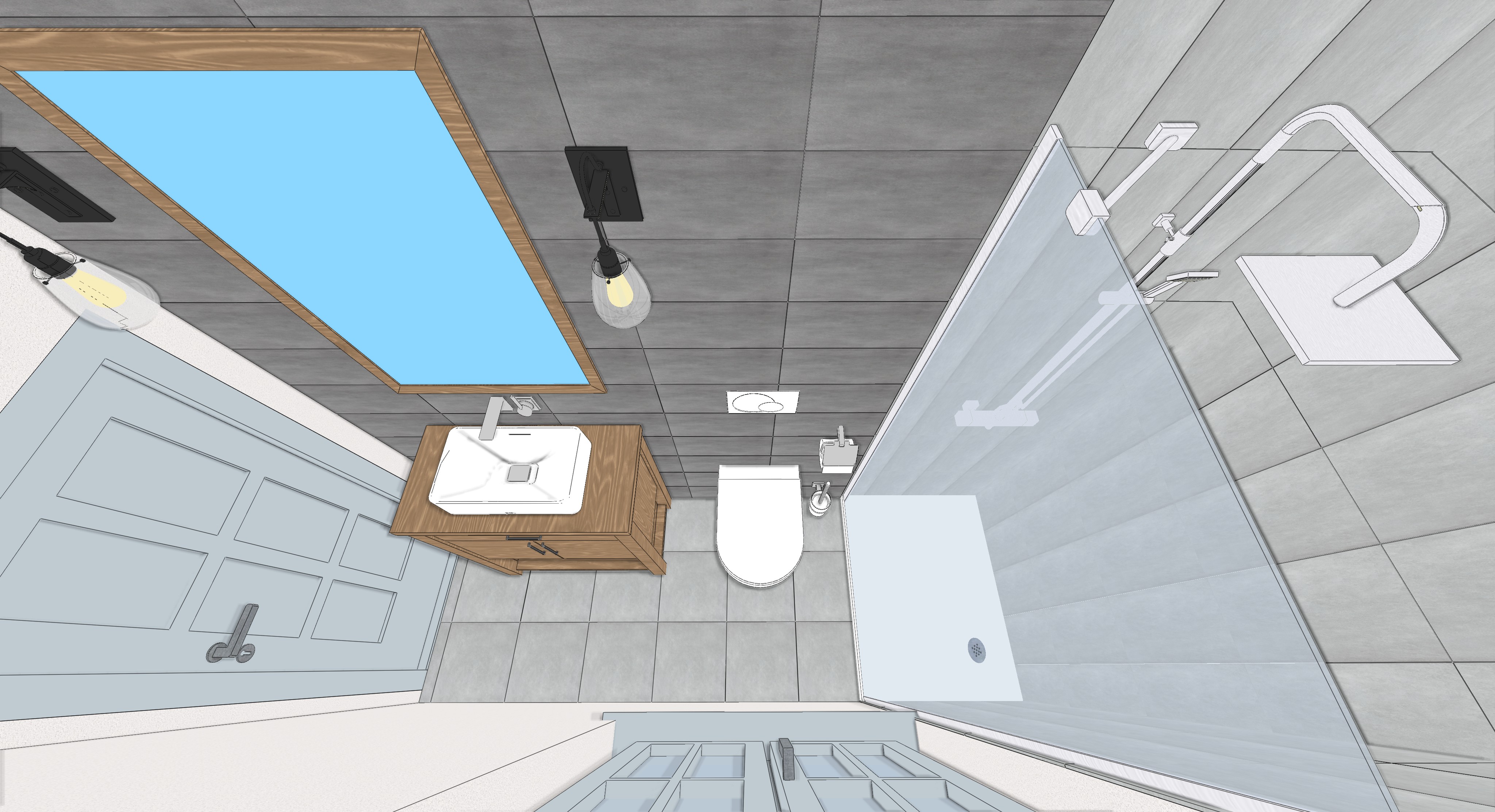 a modern bathroom with a serene and minimalistic atmosphere featuring light grey wall tiles and a matching grey floor the wooden vanity has a warm natural oak finish accented with a sleek white sink on top a large rectangular mirror with a golden wooden frame hangs above the sink on either side of the mirror vintage style black wall sconces with soft yellow lighting create a warm ambiance the shower area is enclosed with clear glass complementing stainless steel fixtures the soft grey door adds to the overall calm and peaceful atmosphere