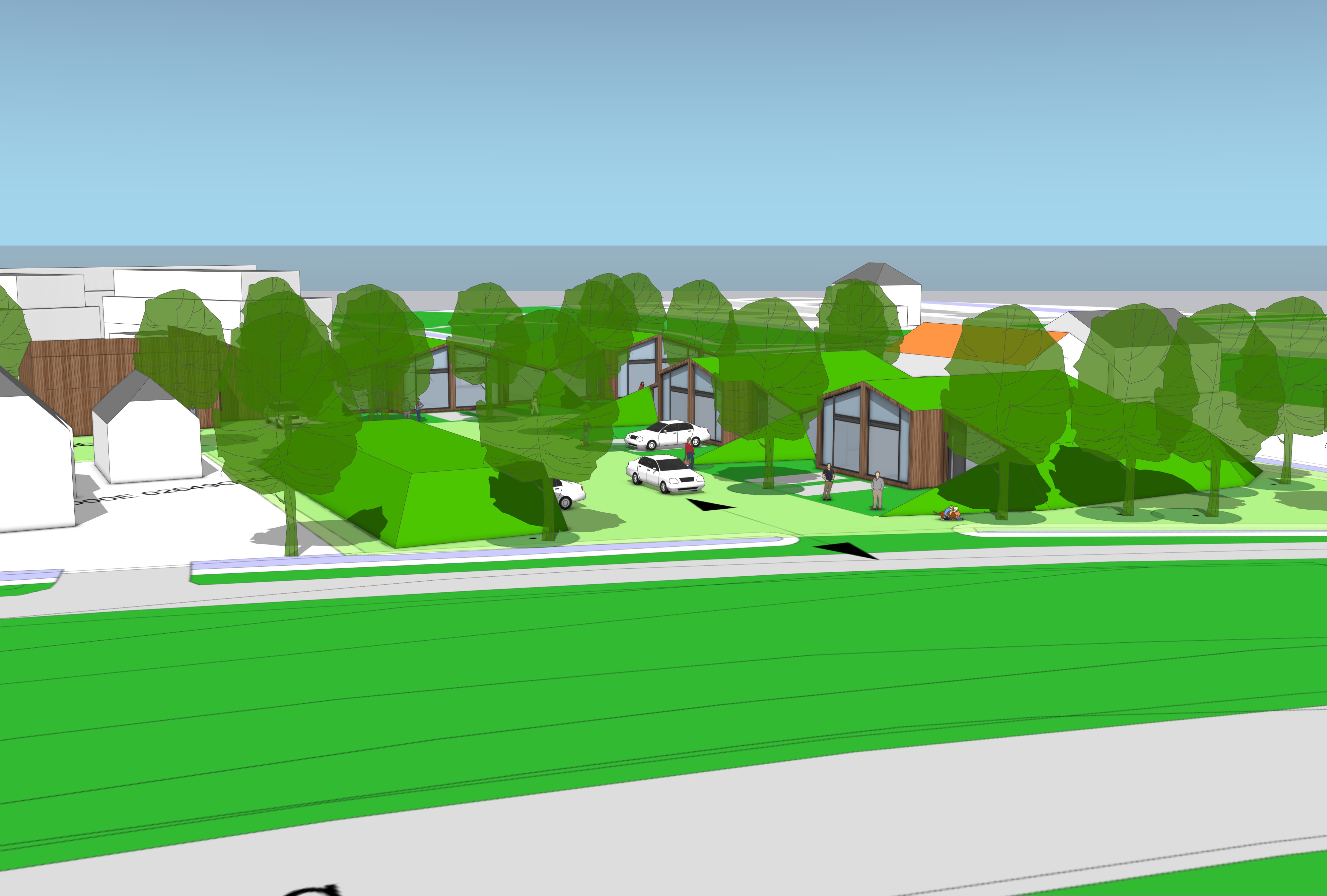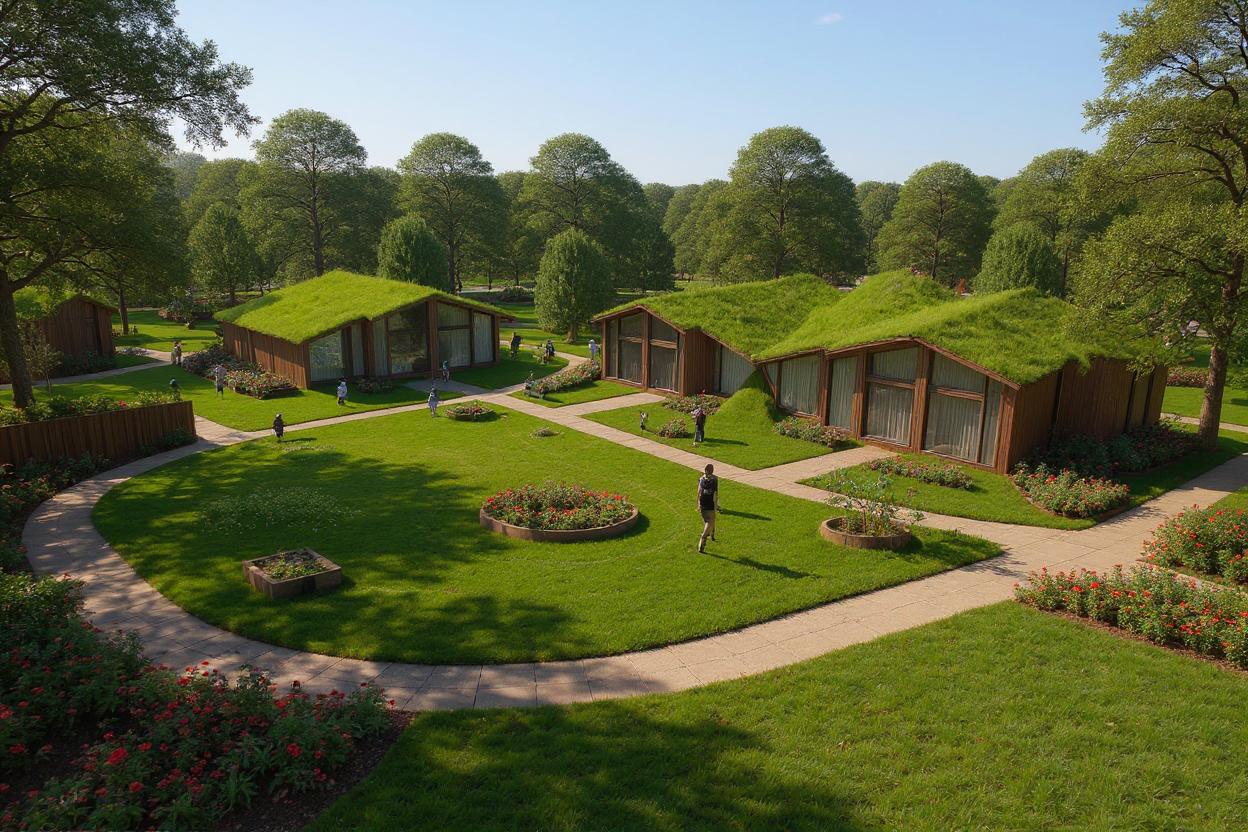 add grass on the green roofs the weather is sunny add a lot of bushes trees and flowers to the scene