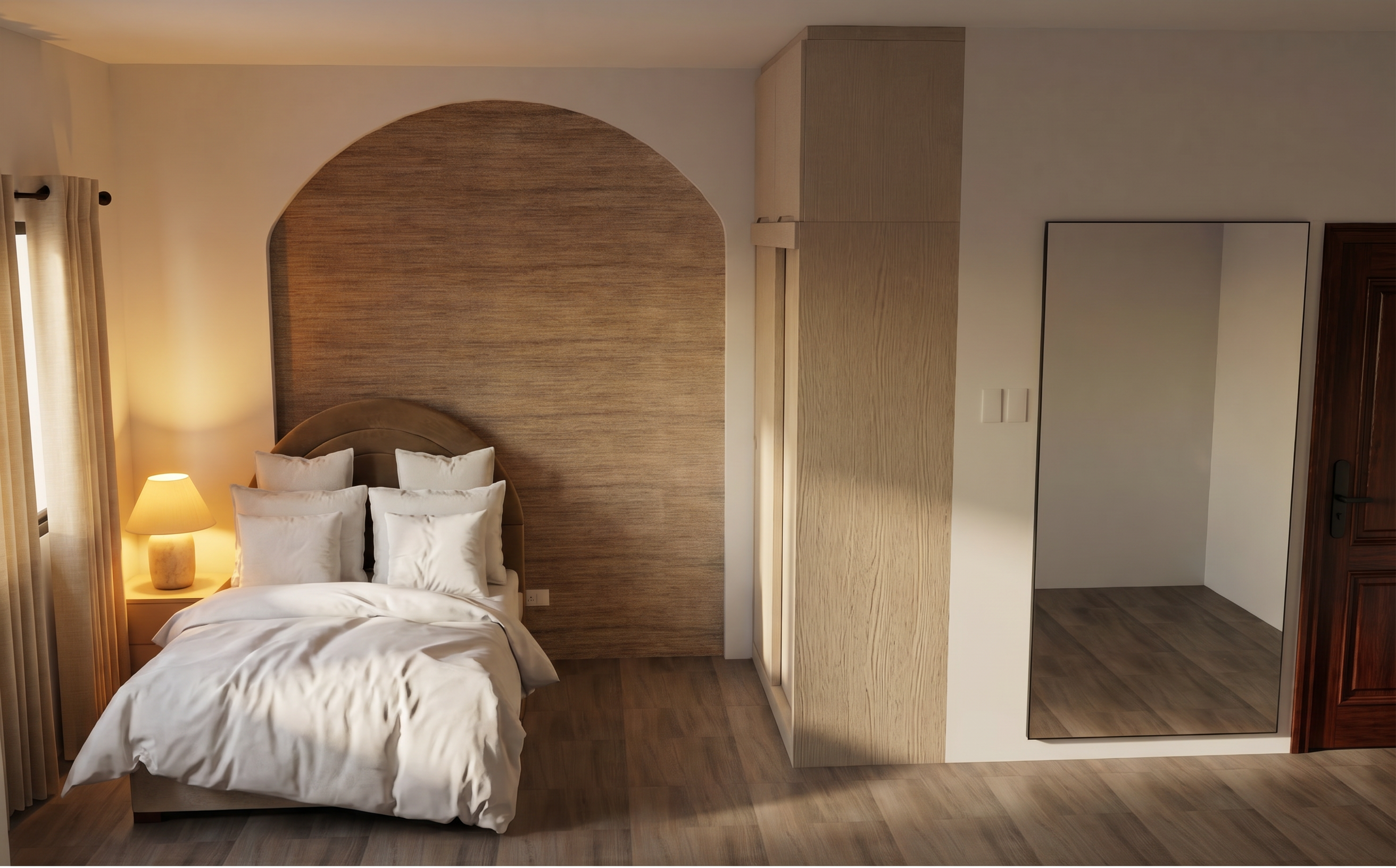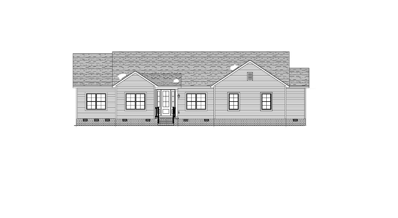 make a front elevation photorealistic as possible while keeping textures the same as shown lightly landscaped in a lightly wooded suburb of south carolina nice lighting remove any text use the following finishes 688a8f vinyl siding fafbf7 trim evelyn bay brick foundation with gray mortar silver birch certainteed dimensional shingles a62e31 6 lite glass one panel front door with 2 glass one panel 3 light side lights faf7f0 posts