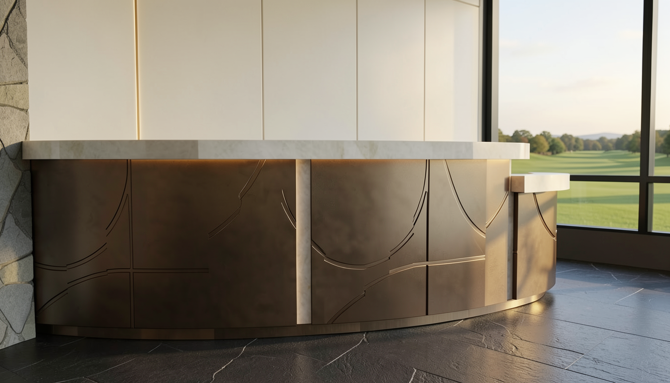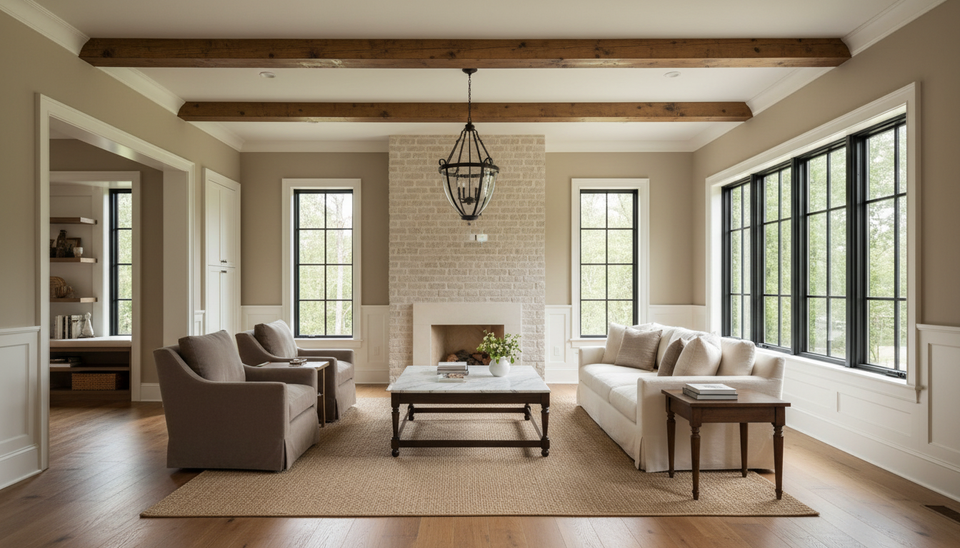 lightly accessorize this kitchen keeping counter tops fairly clear make the lights above the island appear on and keep the white herringbone backsplash and do not change the hutch or lighting shape maintain the color of the wood