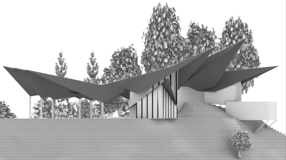 contemporary mountain research station architectural visualization sleek black glass and warm natural wood fa ade with exposed steel framing perched in alpine landscape surrounded by evergreens and rugged rock formations midday sunlight crisp blue sky high contrast reflections on glass warm tones from wood detailed environmental integration realistic materials and lighting cinematic composition archsynth style ultra detailed architectural rendering 8k photorealistic