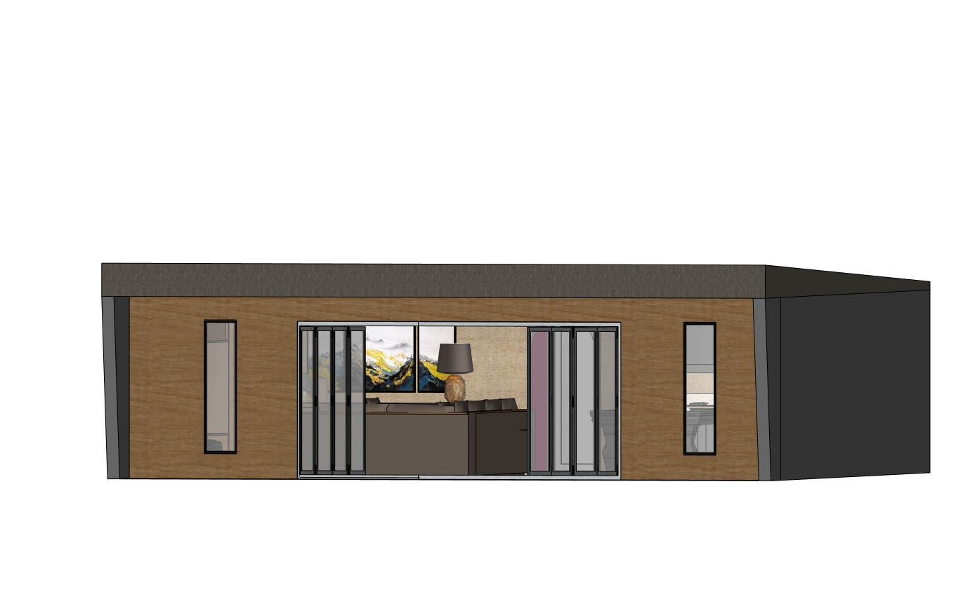 new urbanism exterior shot render a modern rectangular building with a warm wooden facade using rich chestnut brown tones the roof and side edges are sleek and dark gray providing a contemporary contrast large sliding glass doors and windows with a reflective finish enhance the elegance inside depict a cozy interior with a soft beige wall and a dark brown sofa add a modern lamp with a matte black shade and a natural wooden base the painting on the wall features abstract mountains with vibrant yellows and deep blues set the atmosphere in a serene and welcoming dusk light casting gentle shadows and highlighting the textures architecture