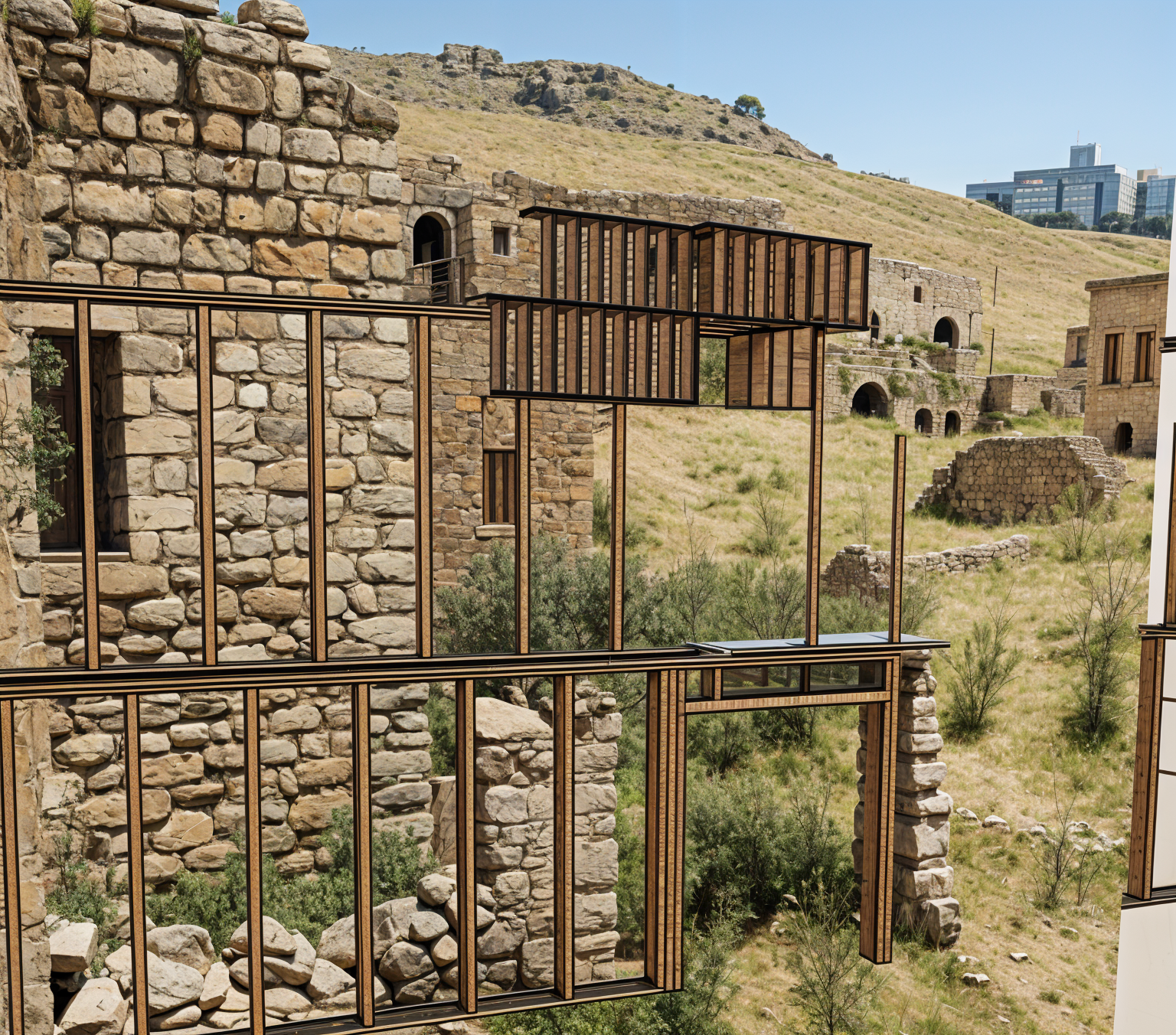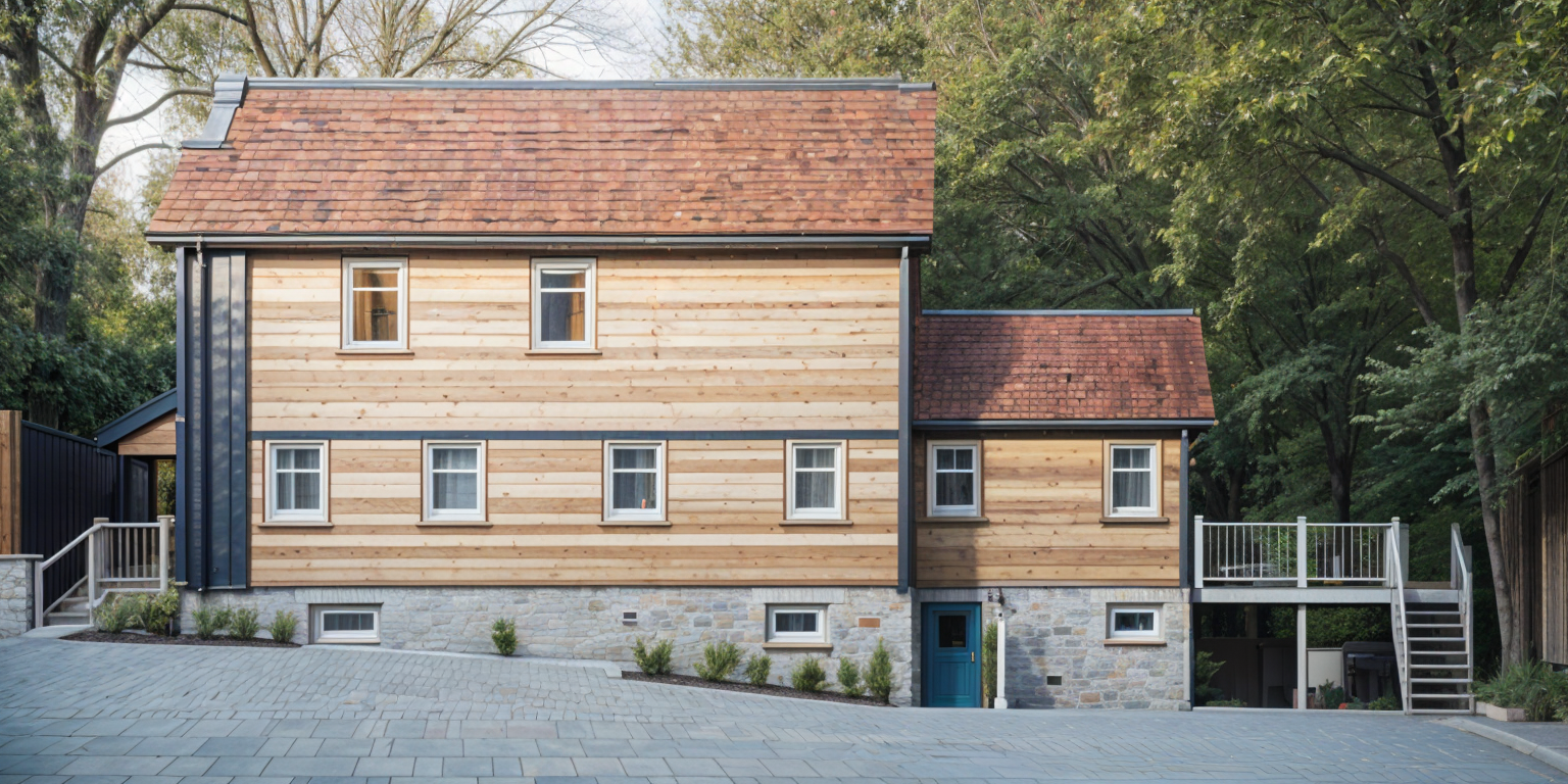 tudor revival exterior shot blue vertical siding with white trim stone veneer below architecture