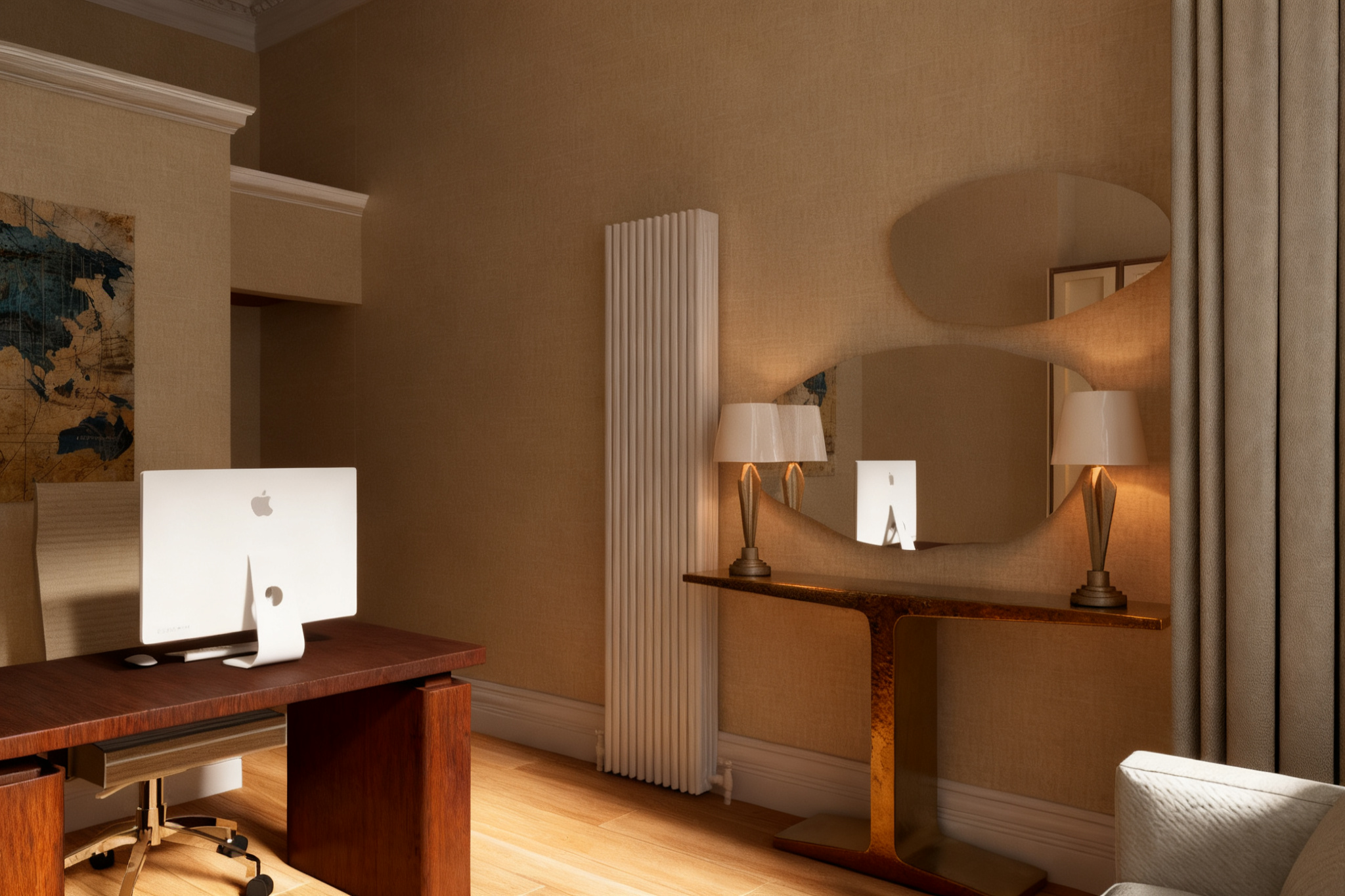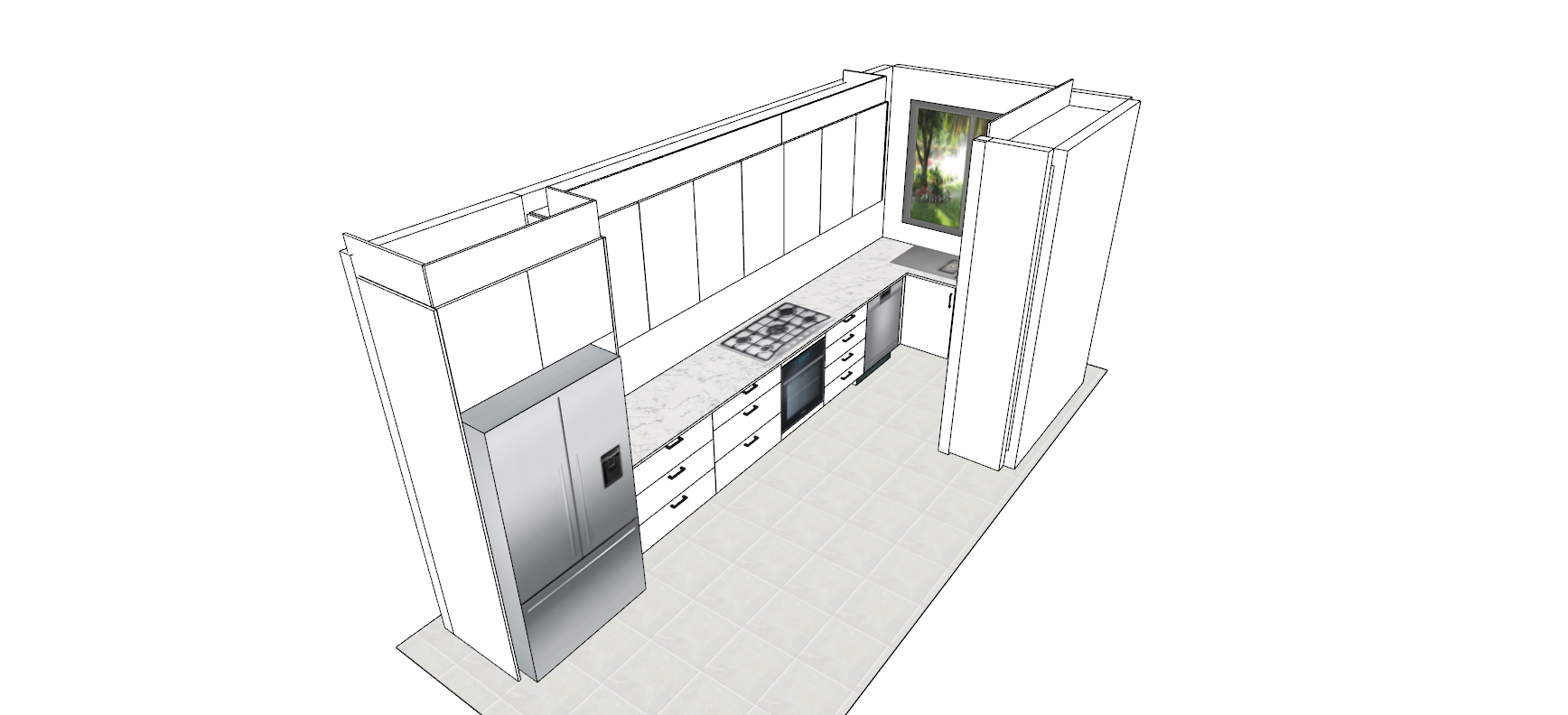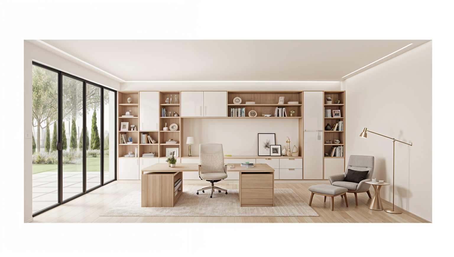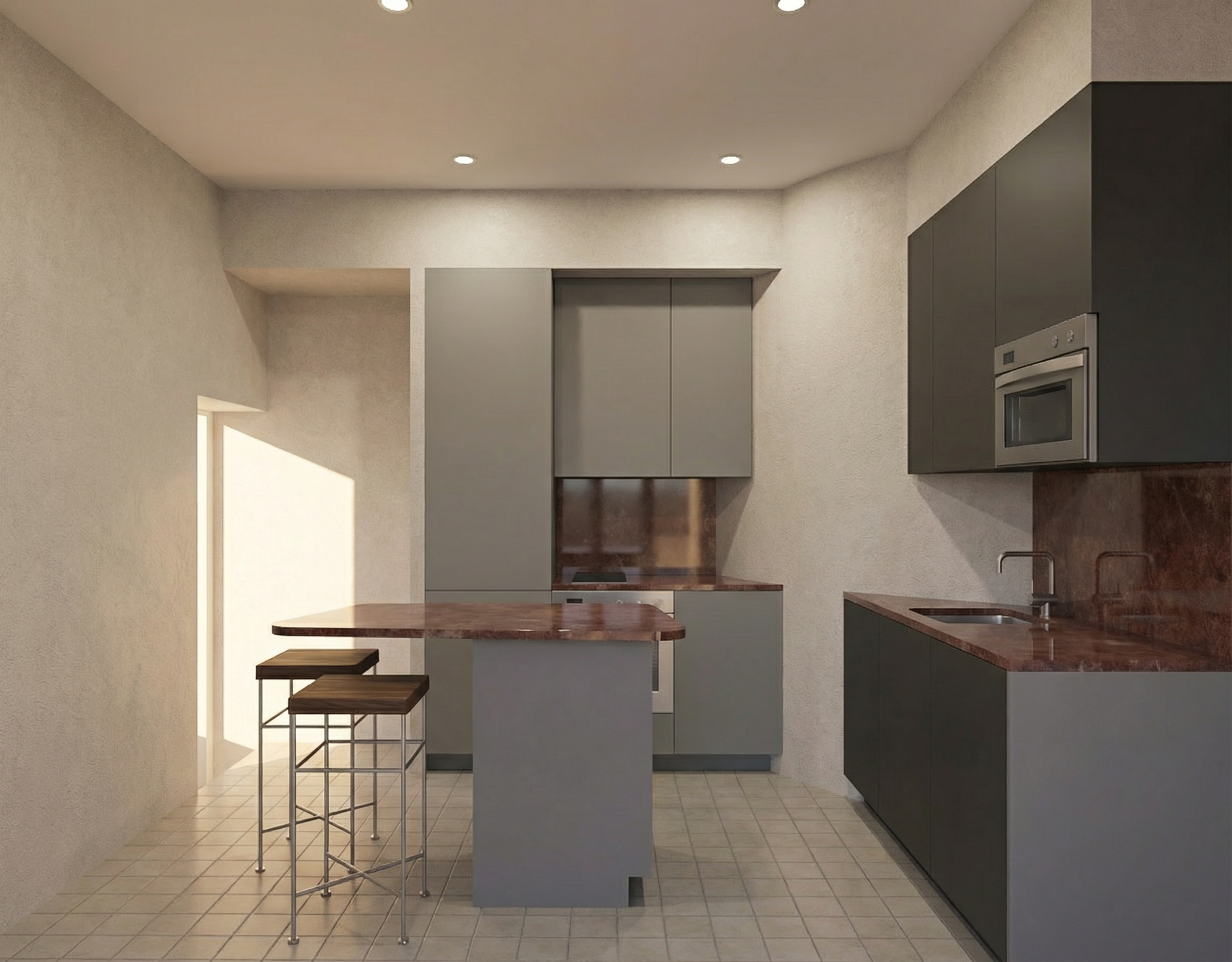 flat white cupboard panels beams of sunlight coming in