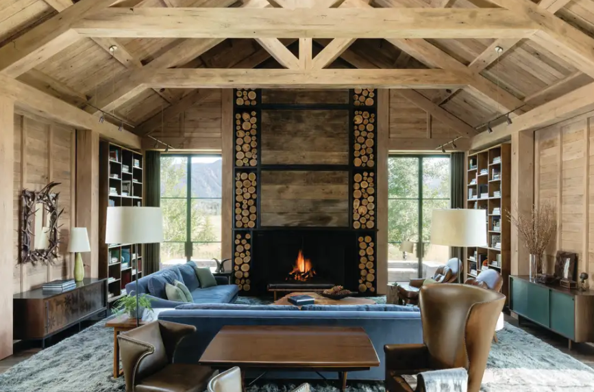 interior shot cozy cabin in park city utah using buttery leather lounge chairs chunky knit throws and low slung oak coffee tables that invite long fireside evenings