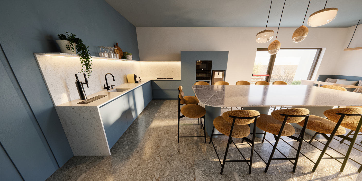 modern plaster walls stone quartz border around linear fireplace with rounded bottom quartz chair with wood and cream chenille