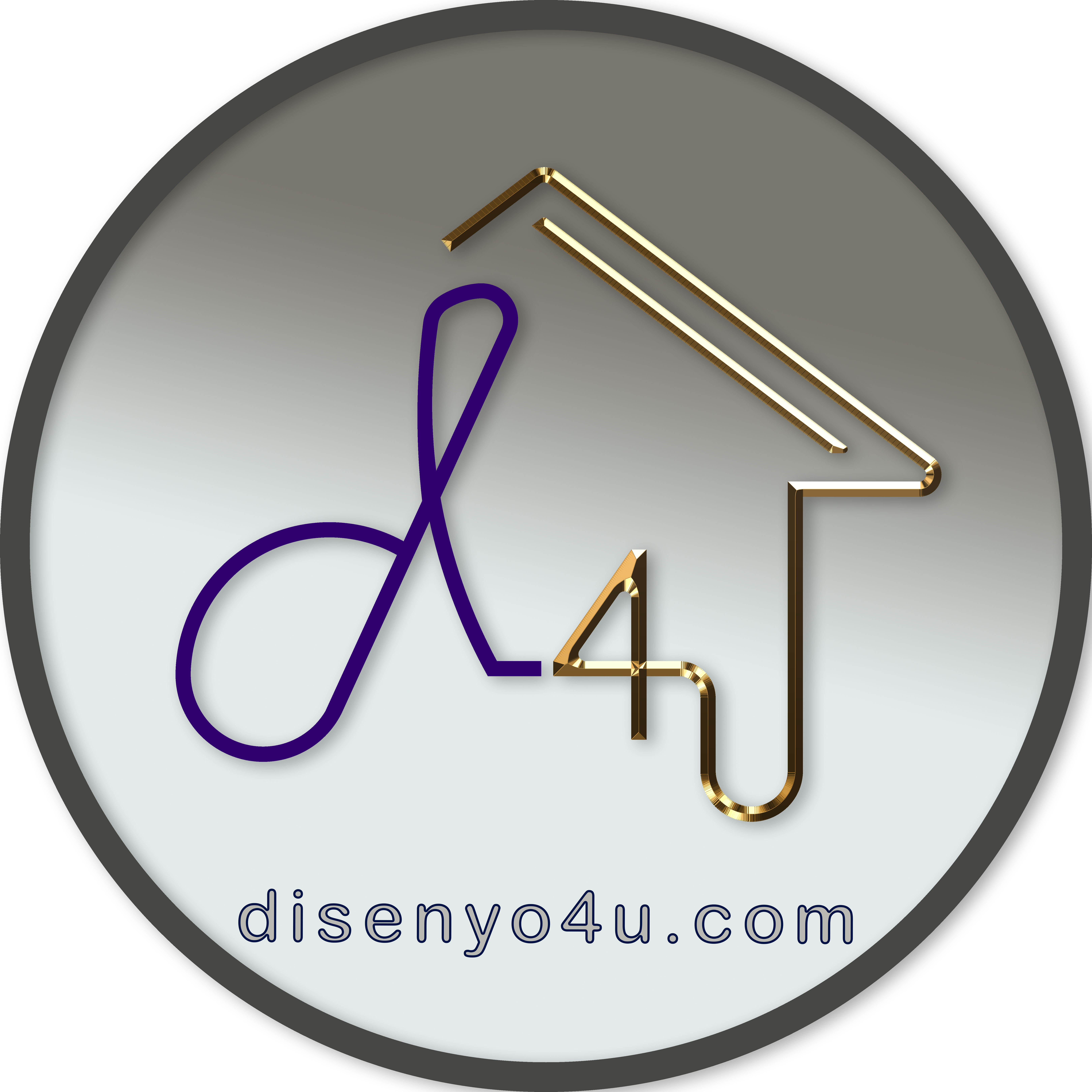 create a high quality 3d render of a circular logo with a metallic gradient background and a dark outer rim the center features a stylized combination of a cursive purple d a gold 4 and a gold house roof outline all raised with smooth beveled edges for a dimensional look add realistic reflections soft shadows and subtle lighting to enhance the metallic surfaces the text disenyo4u com at the bottom should appear slightly embossed or extruded with a clean modern finish overall look sleek elegant professional and premium
