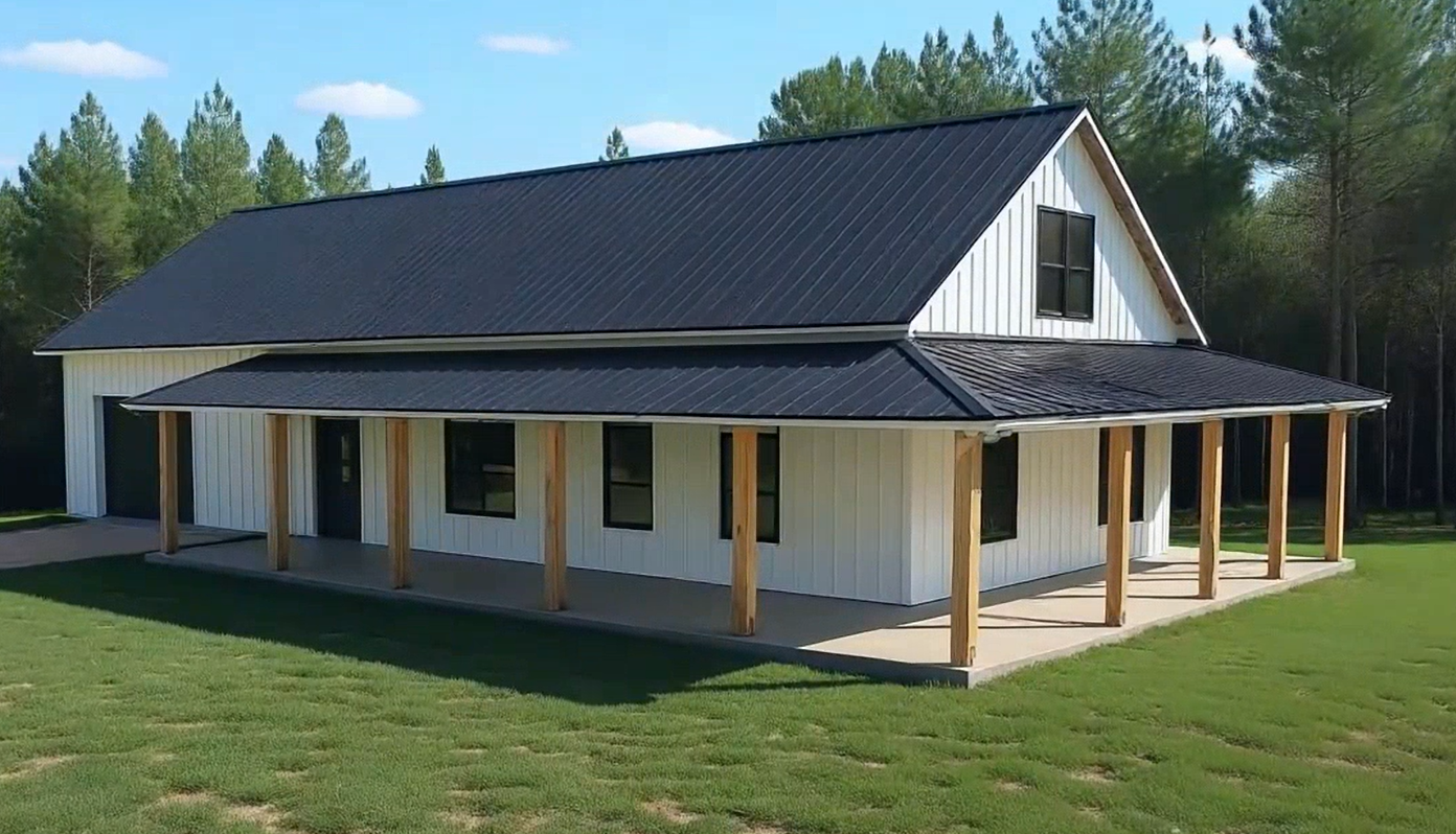 modernist exterior shot render a rustic country house with a modern twist the house features a sleek black roof and crisp white wood siding large wooden pillars provide a warm natural contrast set in a lush green landscape with vibrant trees under a clear blue sky dotted with soft white clouds the atmosphere is serene and inviting capturing a sunny day in the countryside architecture