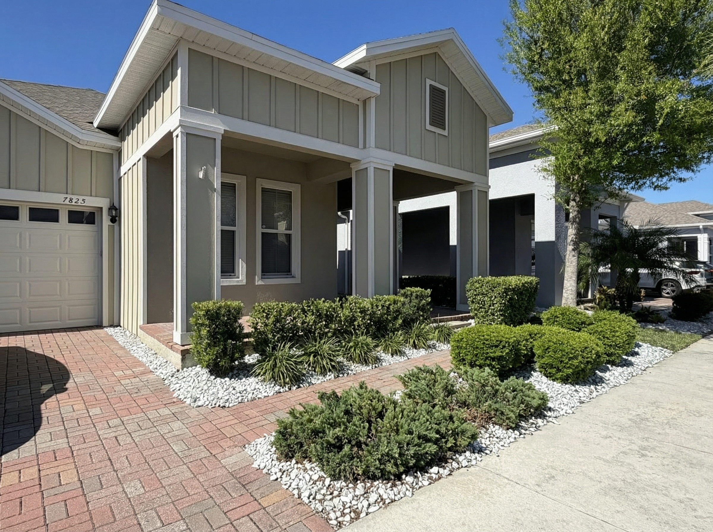keeping everything else as is can we make the siding for the entire house on the right an extremely dark grey and a light layer of snow on the ground the trees in the background need to look wintery