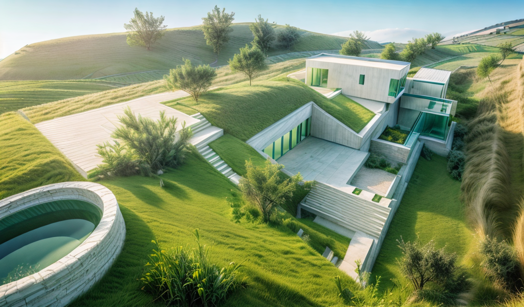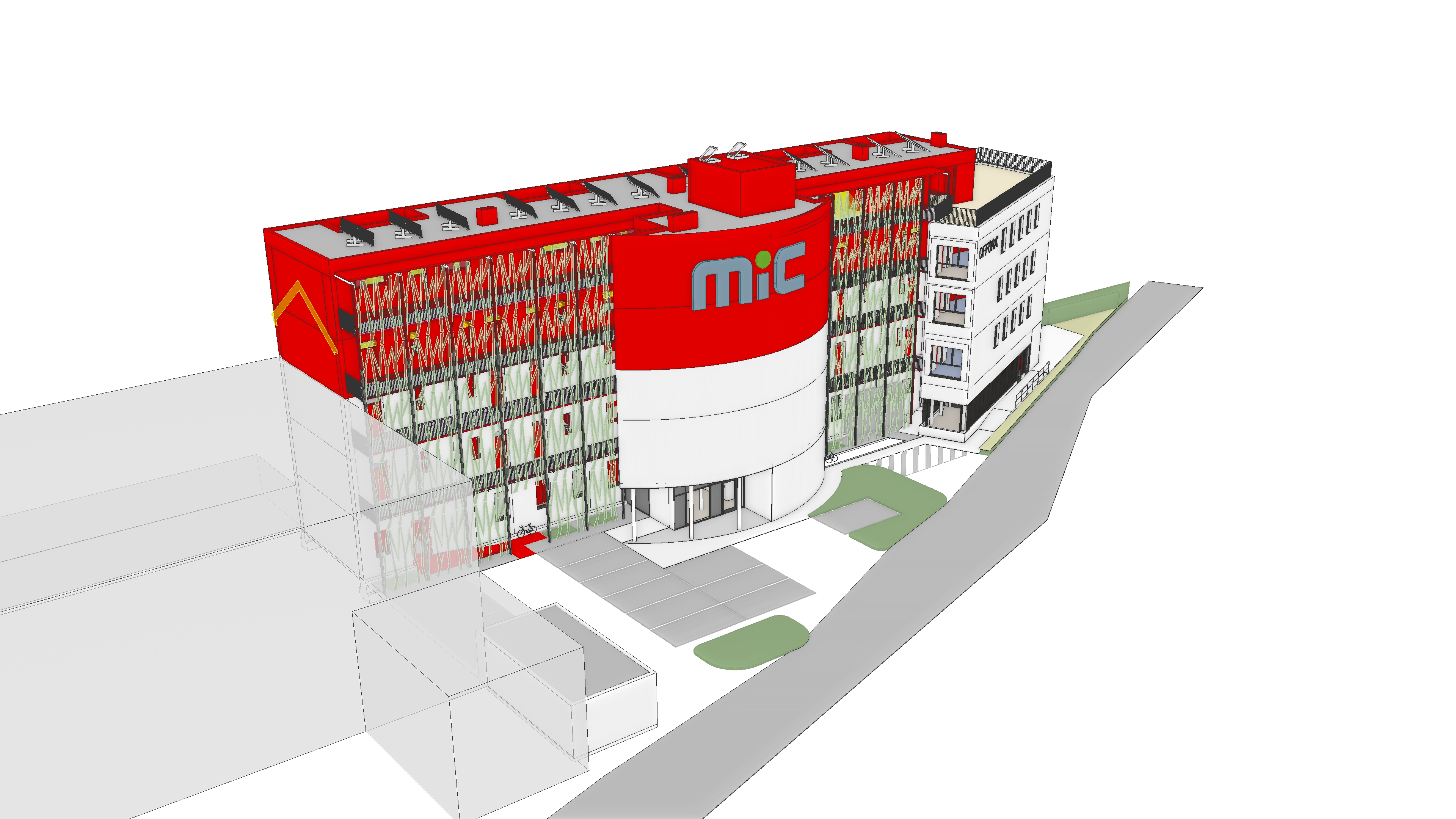 create a digital representation of a modern commercial building in white color scheme the building s facade is decorated with vertical plants giving it a modern natural appearance the cylindrical main entrance is striking white and the word mic the entrance area is designed with some streets and surrounded by small green spaces the atmosphere is light and airy conveying a modern urban ambiance with a clean minimalist aesthetic