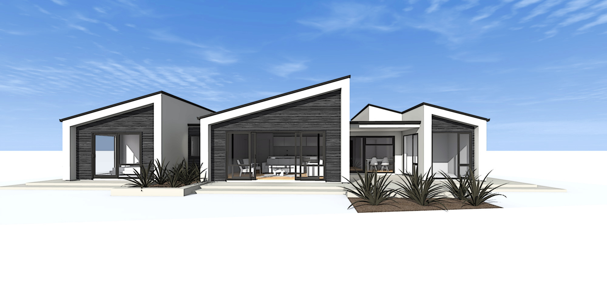 contemporary architectural style lawns sunset trees in background