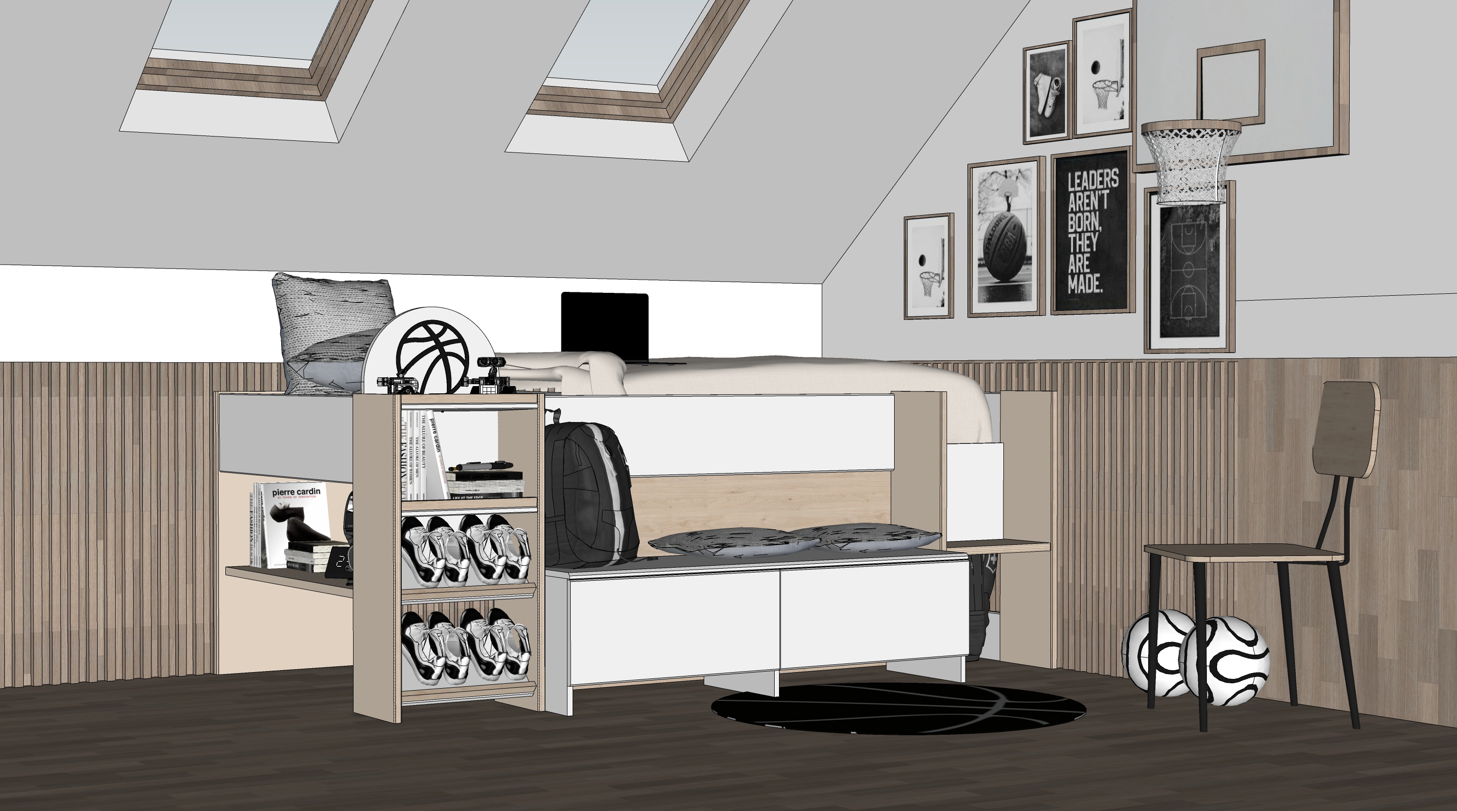chambre enfant avec 1 lit d cor cachemire et blanc satin moderne et minimaliste ambiance naturelle peu de contraste entre ombre et lumi re chambre bien clair sol en parquet clair motif chevrons type terrain de basket mur du fond d cor de panneaux verticaux en bois clair la partie haute et plafond sont blanc et le bas des murs sont avec des lattes bois deux velux ouvert au plafond diffuse de la lumi re style scandinave japandi palette de couleurs neutres beige bois clair blanc une bande led tout le long de la d marcation bois des murs literie avec drap et couettes r aliste coussin poss dant une texture laine boucl textur tableau en arri re plans rendre plus r aliste avec des effets de vitre photographie ultra r aliste textures tr s d taill es clairage naturel cin matographique ajoute profondeur de champ r aliste quilibre parfait des couleurs qualit 4k ultra hd rendu architectural professionnel