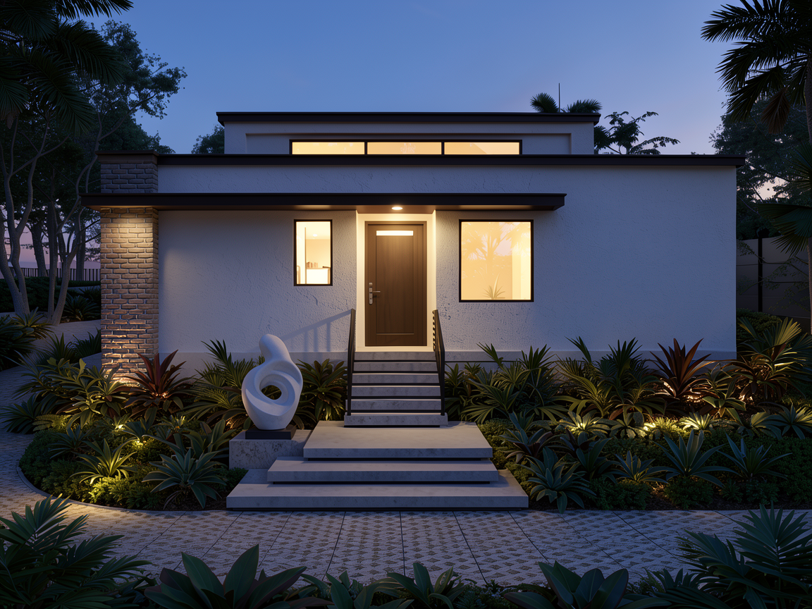add modern bedroom furniture to this master bedroom placing the bed up against the left side wall and keeping original look of photo