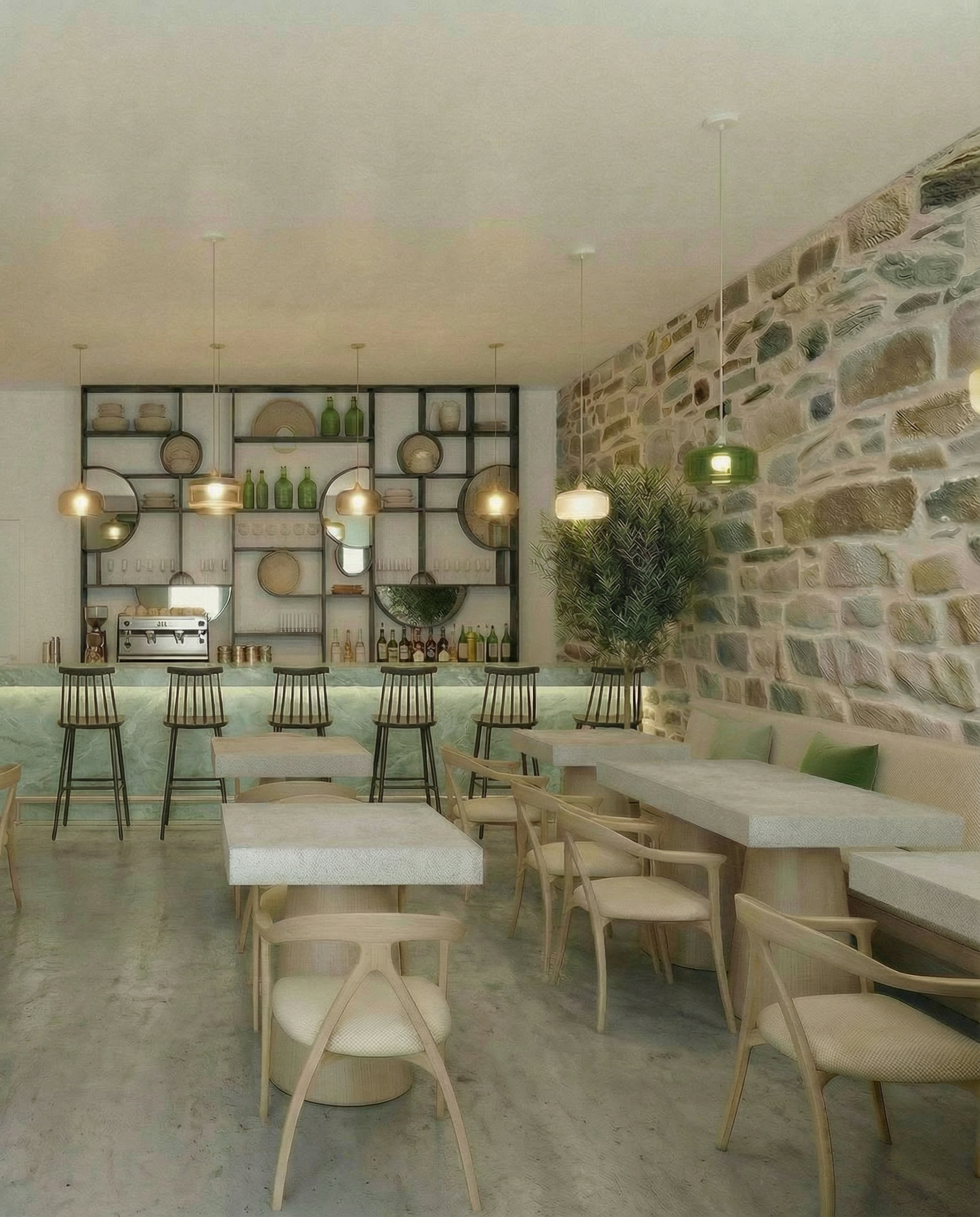 put only at the vertical surface of the bar a nice light green marble the top surface keep it as it is grey as the tables