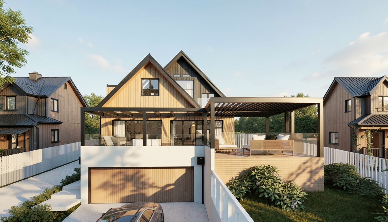the two storey luxury home is surrounded by a other residential homes and ascattering of australian native trees bushes with modern australian lansdcape design the external finishes are concrete with monument features