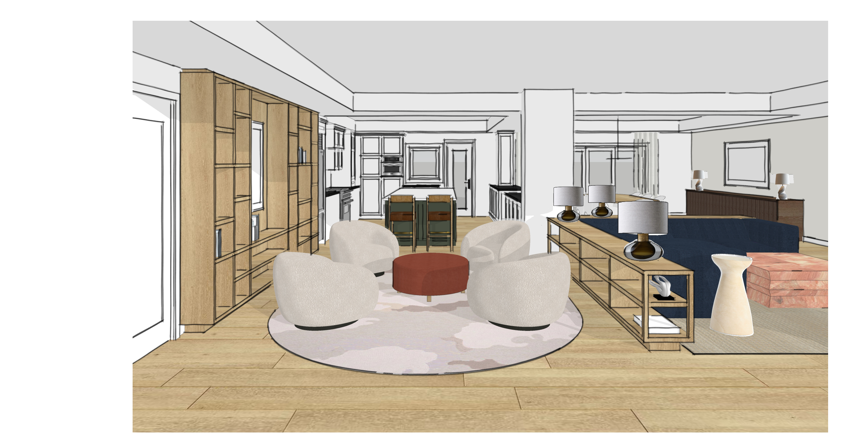 create a highly realistic render of a modern open plan living room and kitchen based exactly on the attached sketch do not add or remove any architectural elements such as windows doors or walls maintain the existing layout proportions and furniture arrangement the atmosphere should be warm and inviting with soft natural light filtering from the back windows the walls are pure white for a clean bright look the bedroom door is solid white the seating area features plush curved ivory fabric chairs arranged around a velvet terracotta red ottoman placed on a soft cream rug with subtle abstract patterns the flooring is light oak wood adding warmth and texture against one wall a large natural oak bookshelf is partially filled with a few books and minimal decor opposite a long low oak bookshelf sits behind a dark blue velvet sofa styled with coffee table books and two modern table lamps with dark glass bases and white shades next to the sofa is a light red marble coffee table placed on a light cream rug paired with a sculptural side table in the background the kitchen features sleek white cabinetry silver appliances and a dark green island with seating keep the island s green color exactly as in the sketch beyond the dining area includes a walnut credenza the final render should emphasize realism natural textures accurate materials and lighting while preserving the exact design shown in the sketch with no extra windows openings or architectural changes