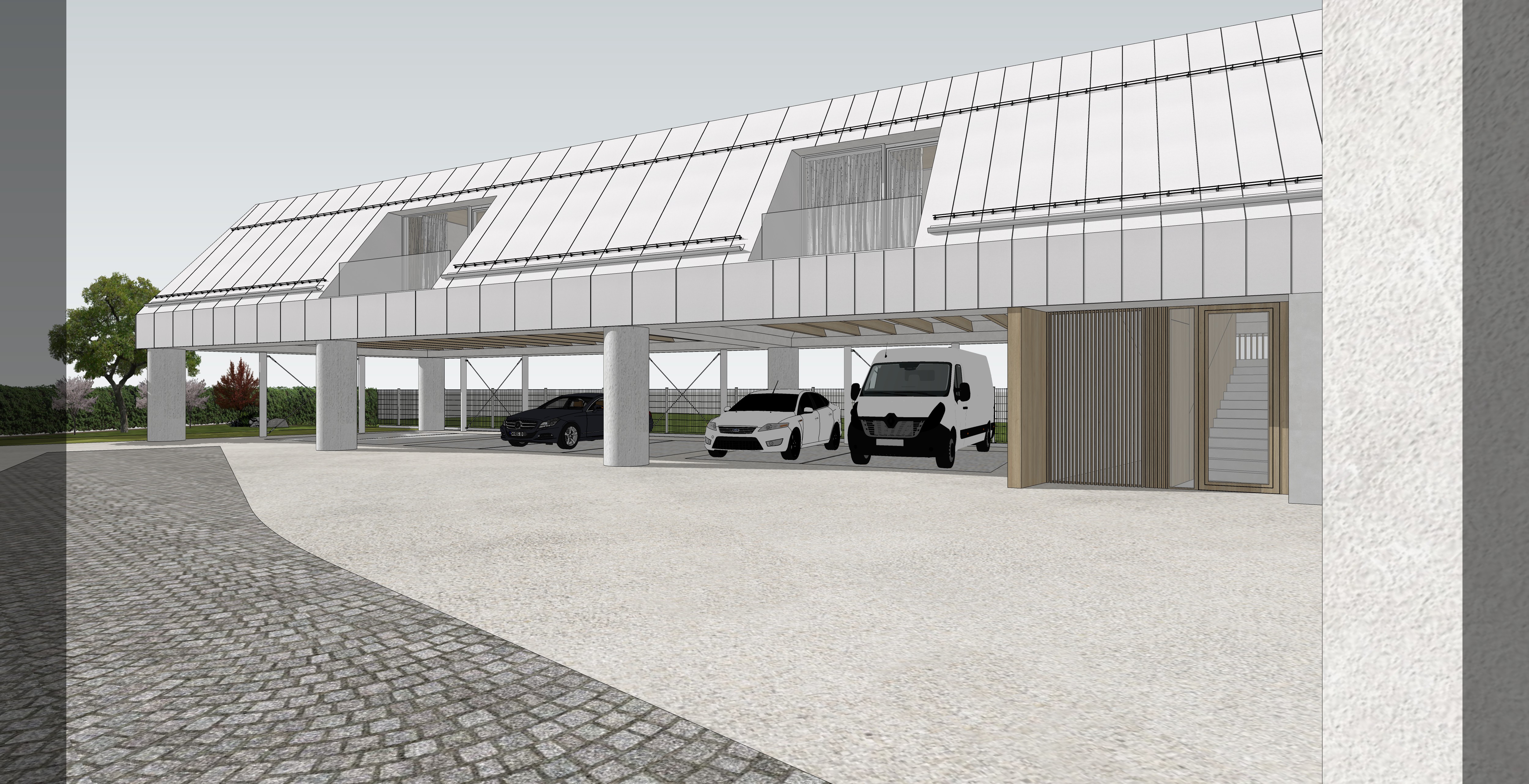 photorealistic visualization roof material gray sheet metal columns concrete greenery real grass winter lights and clouds walking area interlocking paving stones granite grey