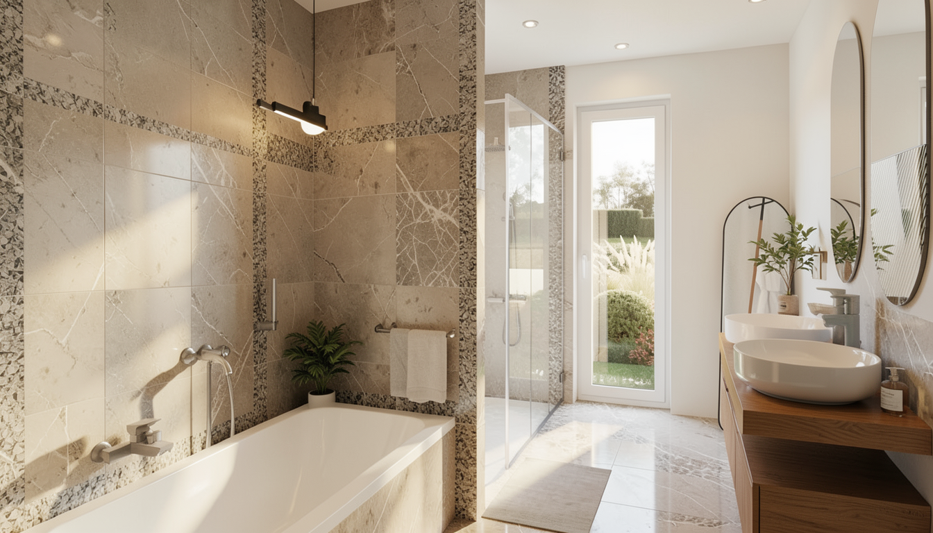 cr ez un rendu 8k avec une visualisation architecturale hyperr aliste tous les meubles et l ments architecturaux doivent rester en place la configuration spatiale doit rester inchang e mettez l accent sur des reflets doux et chauds des ombres subtiles une richesse de couleurs accrue et un r alisme luxueux assurez un clairage naturel g n ral dans la pi ce ajoutez du carrelage luxueux au mur qui encadre la baignoire ainsi que sur les murs qui encadrent la douche ajoute du carrelage luxueux au sol qui sera le m me que sur le bas de la baignoire couleur blanche au niveau du plafond ajoute luminaire d coration objet et plante pour rendre la plus r aliste le meuble de la salle de bain est en bois r aliste de couleur chaude la baignoire est en acrylique blanche brillante le bas de la baignoire est dans le m me rev tement que le sol remplace le robinet de la baignoire par un autre plus r aliste