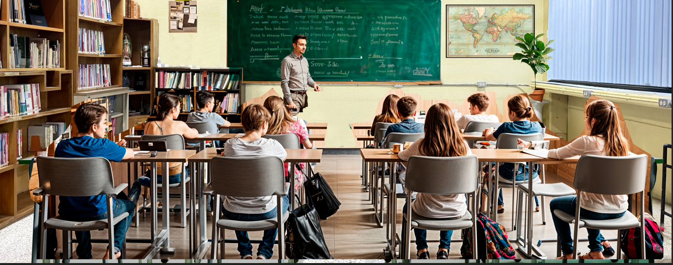 put male and female students ten years old sitting on gray plastic chairs facing backwards the surface of the tables is white with an olive green edge